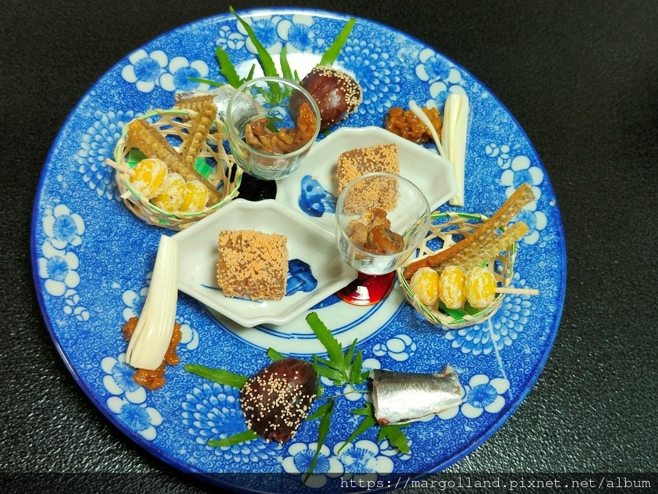 前菜:鰻魚骨仙貝/烤銀杏果(外面裹一層香香的粉吃不出來),醋醃沙丁魚,栗澀皮煮