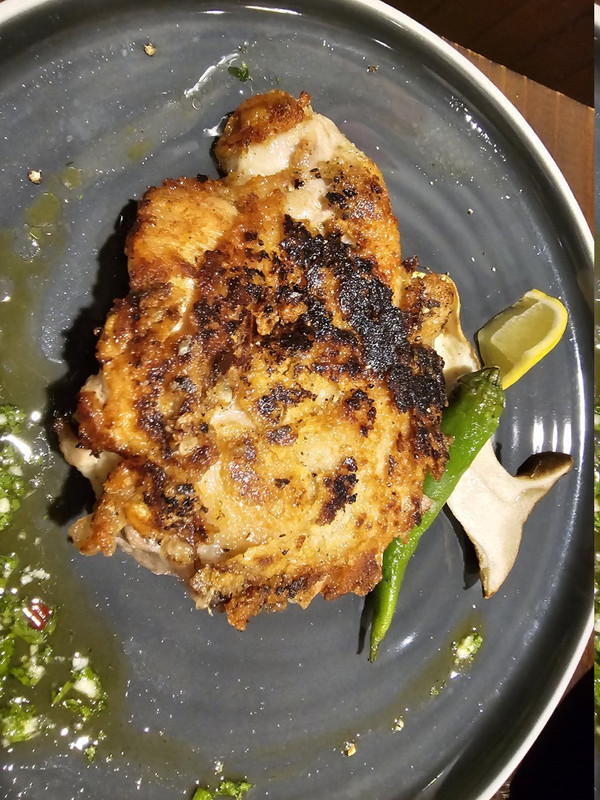 主菜上桌。我們不吃炸的所以改成用煎的雞腿排。我覺得滿香的,佐料也挺好吃的。