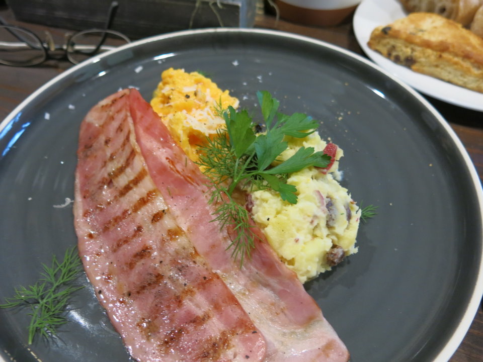先上沙拉之後接著就是主菜啦。有培根跟香腸兩種可以選。配上炒蛋跟馬鈴薯泥。