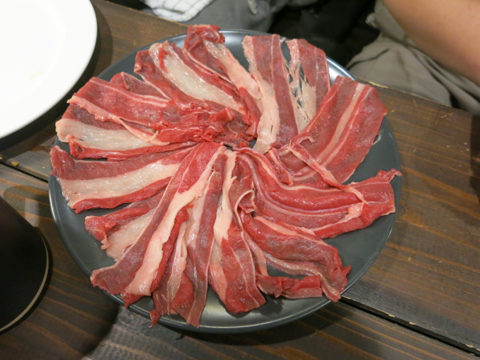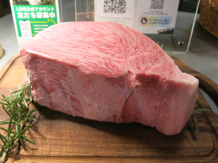 一進入餐廳就看到早上放著麵包的桌子上放了一大塊和牛。