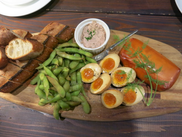 第一道是開胃菜。有烤麵包配鵝肝醬跟自家製煙燻起司,還有糖心蛋跟毛豆。
