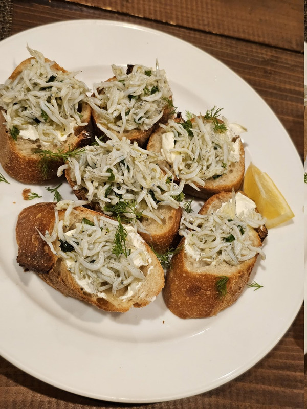 第一道前菜是烤麵包配吻仔魚。滿好吃的。