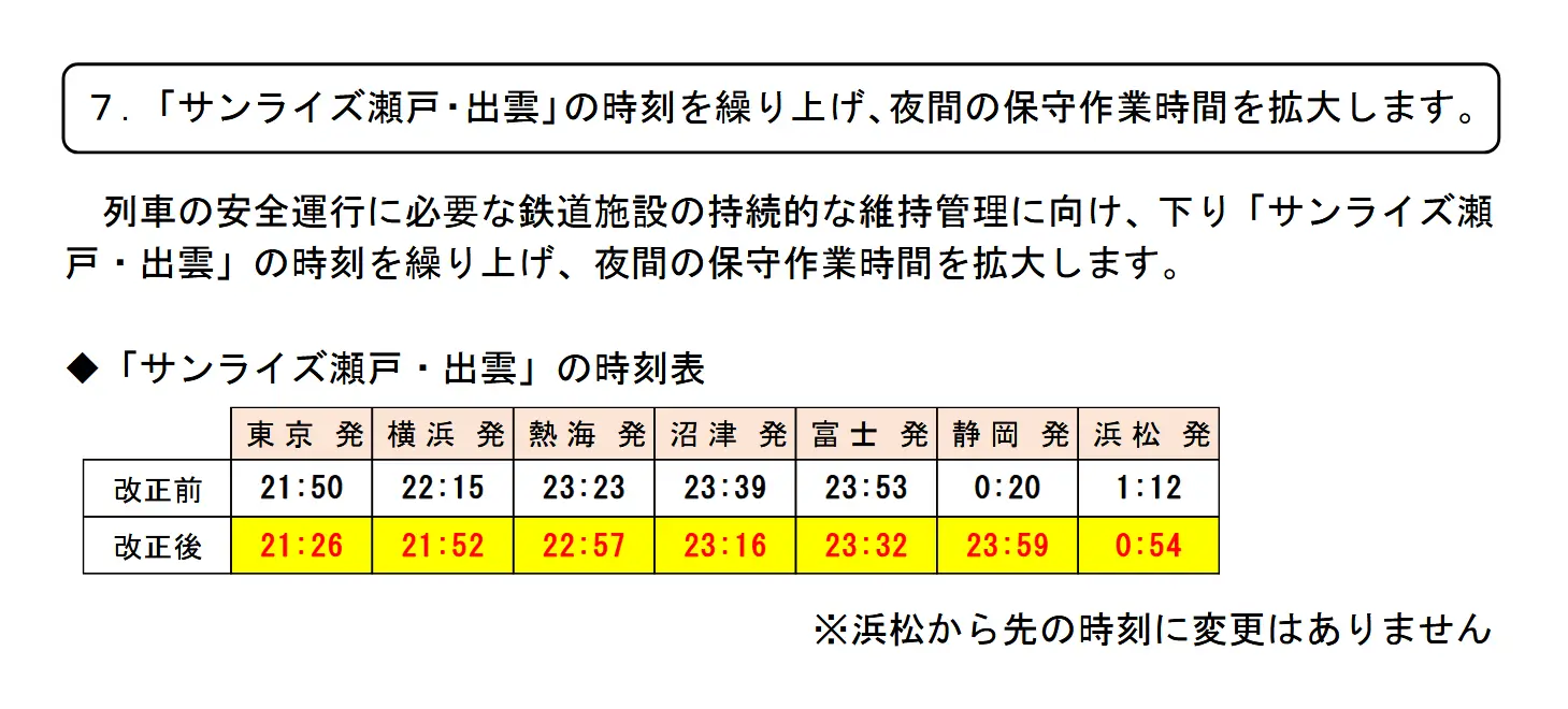 7. 因應JR東海範圍夜間維修,Sunrise出雲/瀨戶往出雲市/高松提早出發