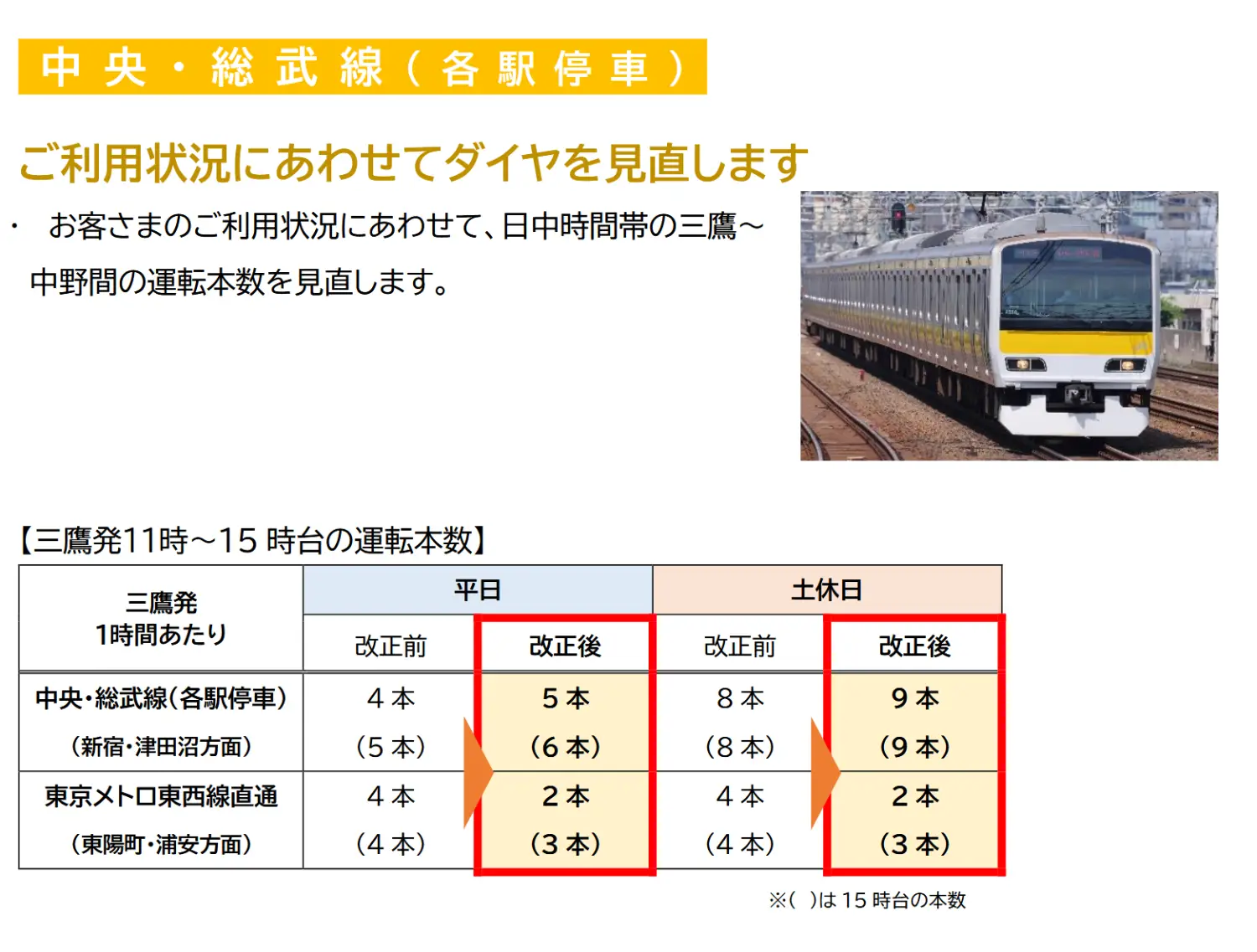 3. 中央總武線各站停車中野~三鷹間增加,並減少直通地鐵東西線班次