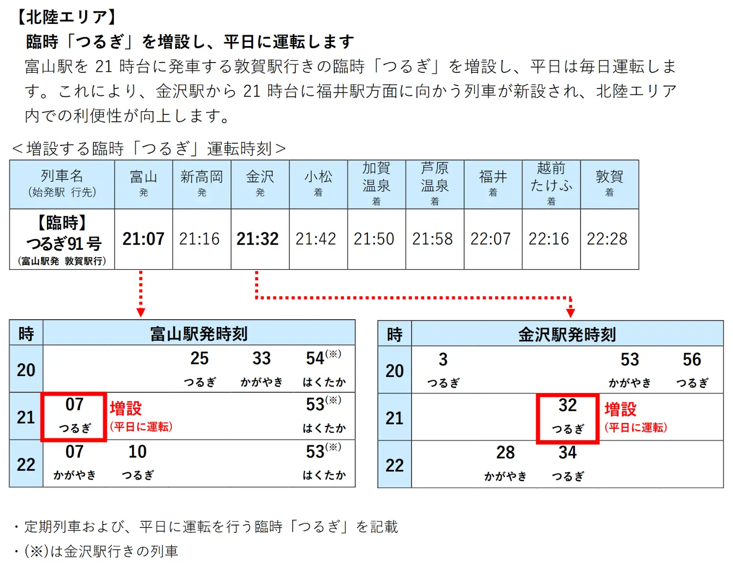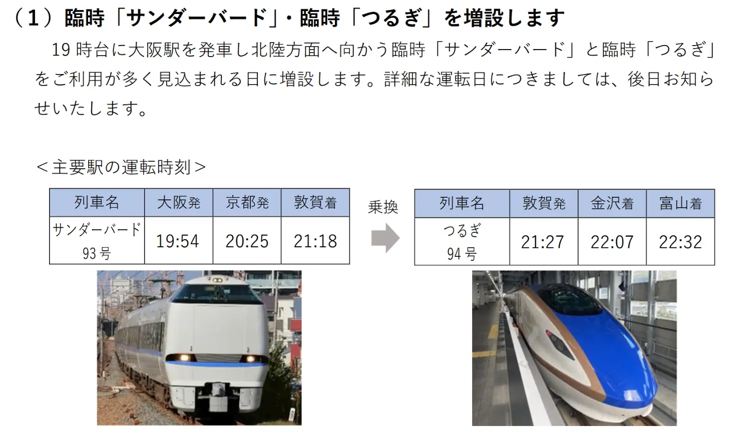部分繁忙日期將新增THUNDERBIRD→つるぎ晚上大阪敦賀轉乘往富山的班次