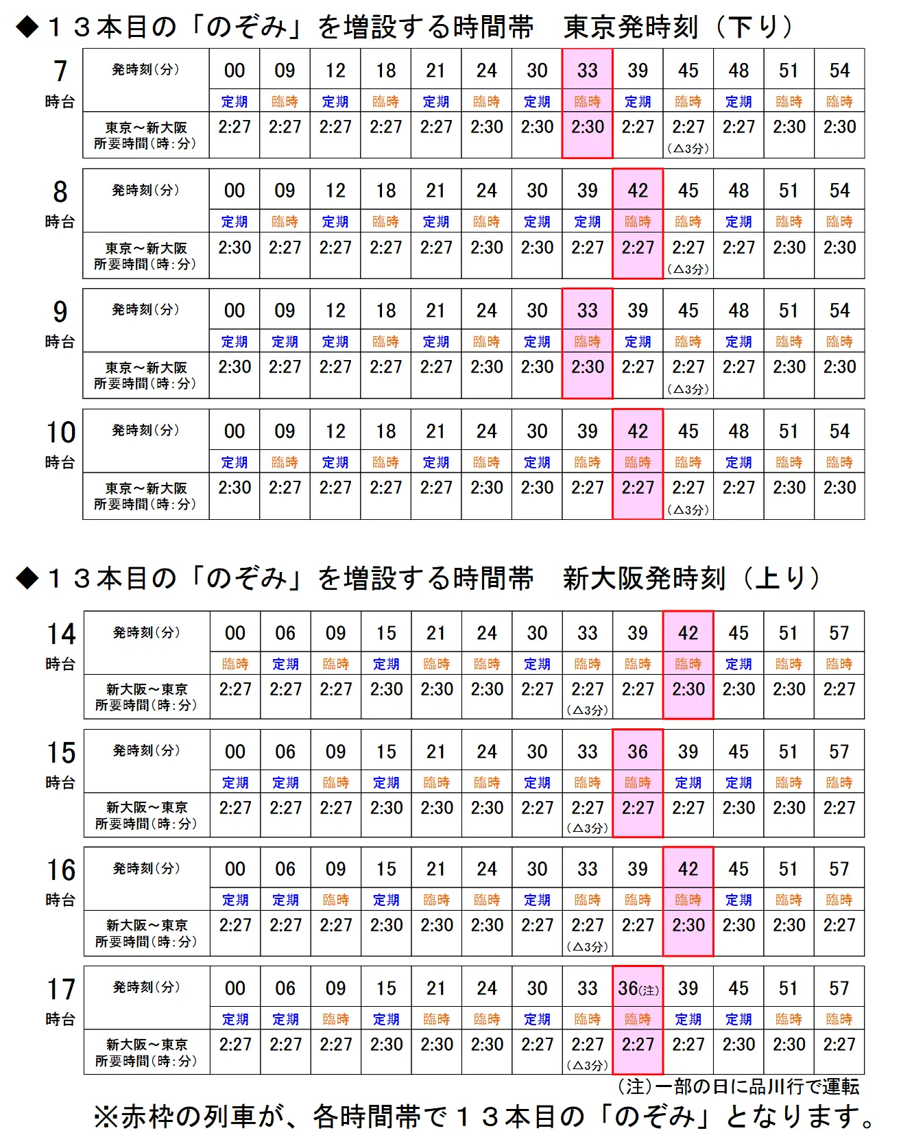 1. 部分時段東京~新大阪間再增開のぞみ,一小時のぞみ最多12→13班