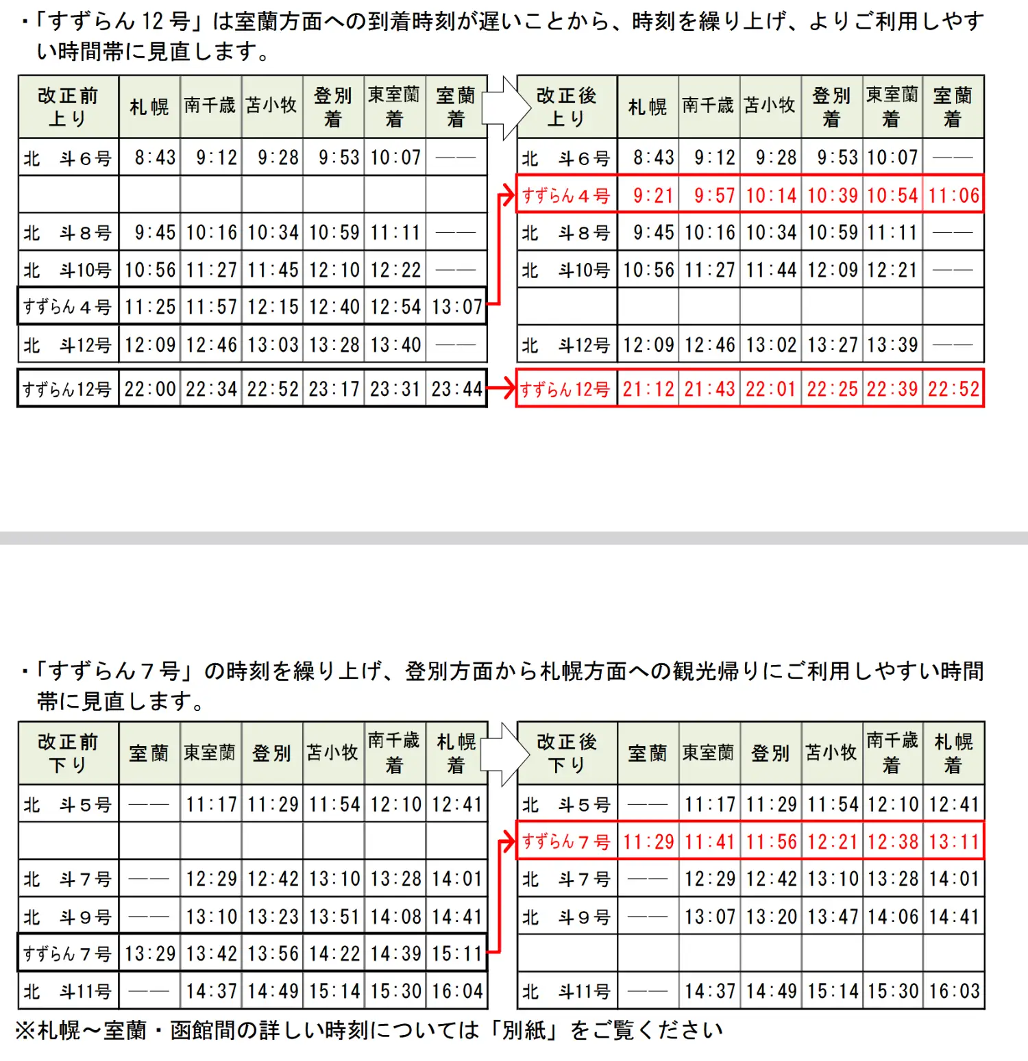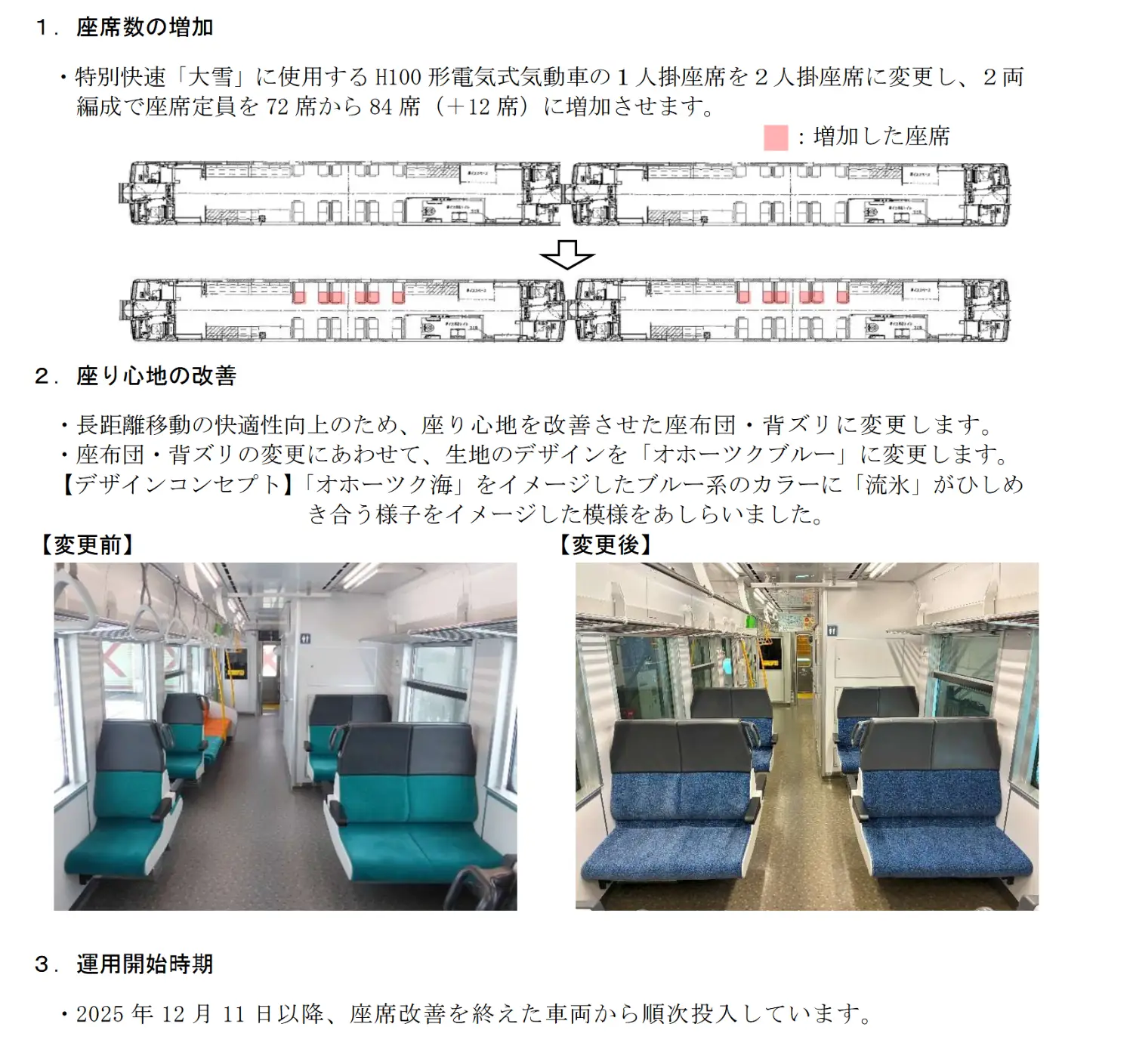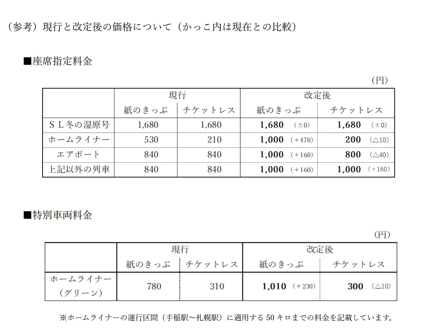 1. 札幌旭川間取消自由席,亦即JR北海道全數特急列車都改為全席指定