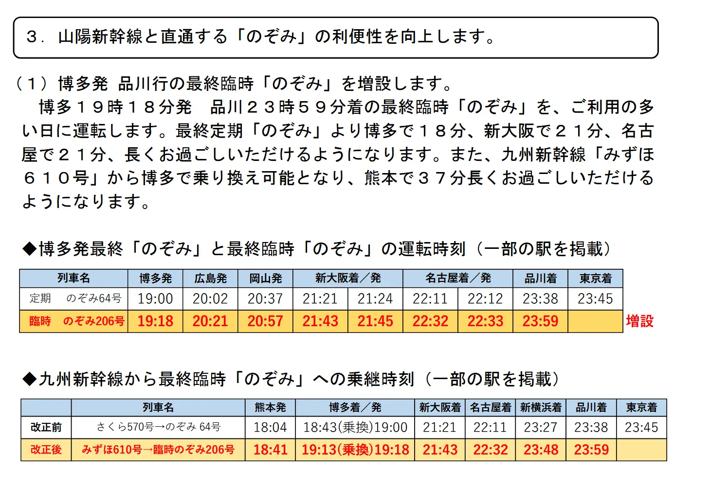 3. 增發博多19:18→品川23:59的臨時のぞみ