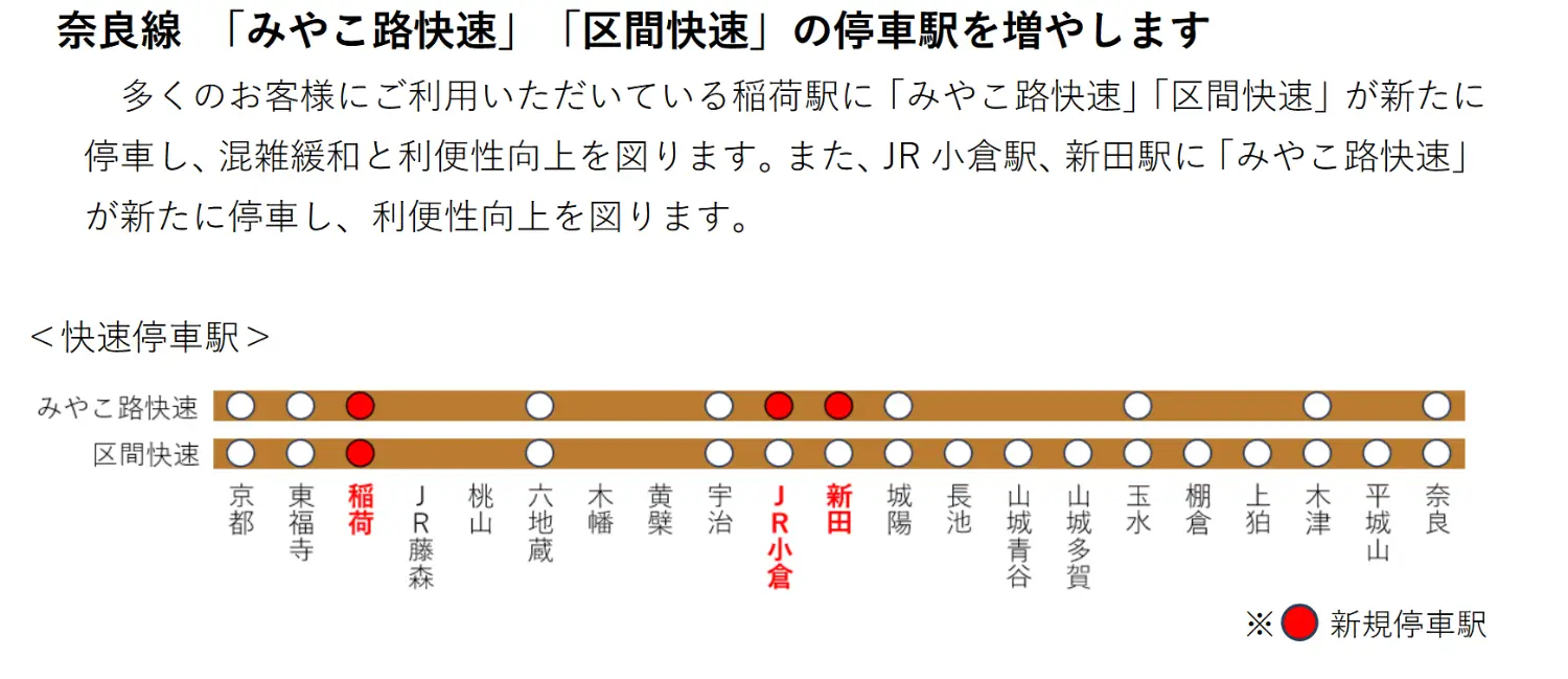 5. 奈良線快速簡化為2種,且全數停靠稻荷