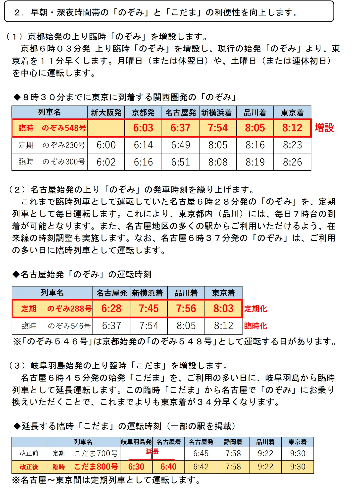 2. 改善京都、名古屋早晨往東京的のぞみ班次,假日會有京都始發のぞみ