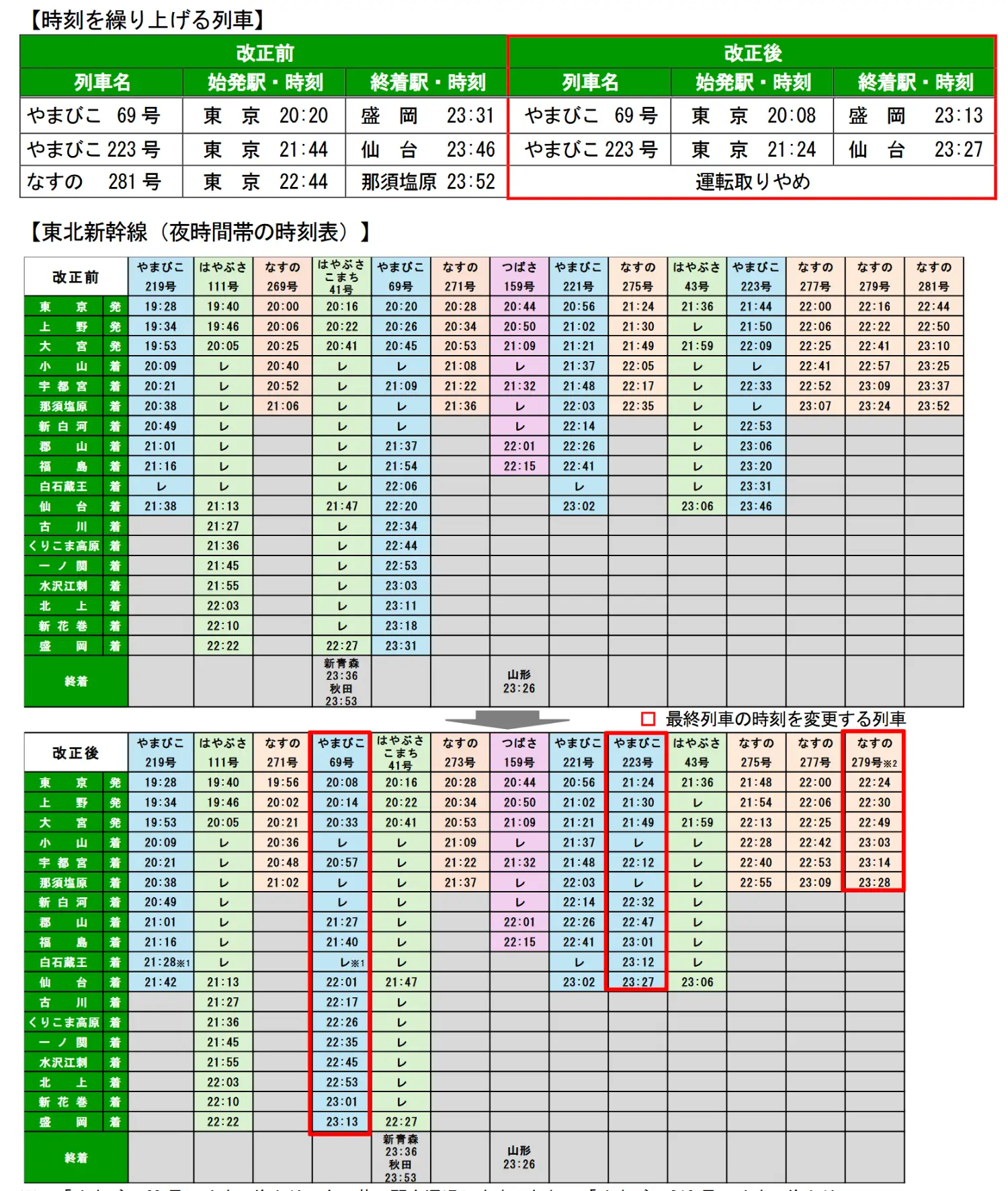 東北新幹線往大宮~仙台方向約提前半小時收班