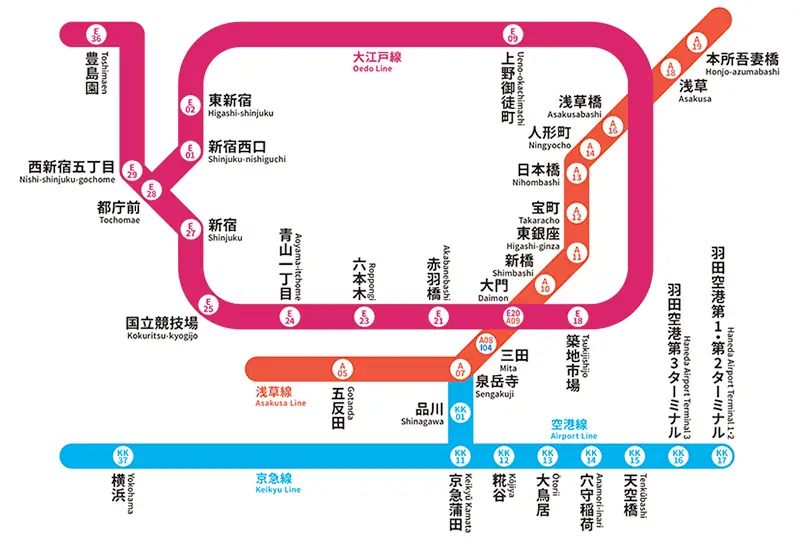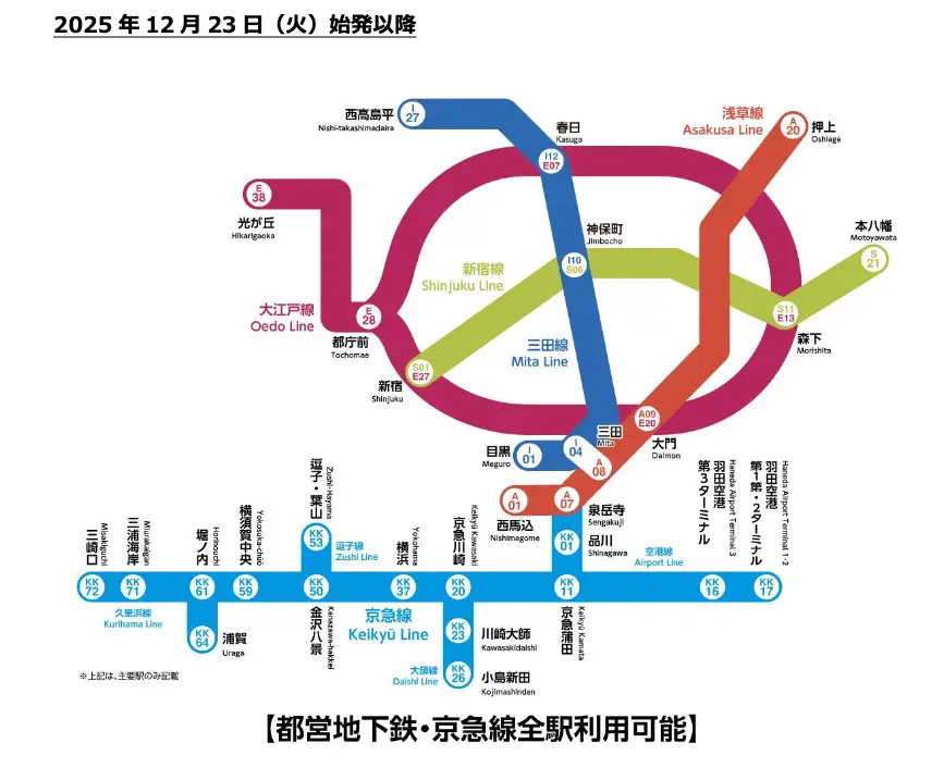 (都營地下鐵包含淺草線、新宿線、三田線、大江戶線4條,直通僅限京急適用)