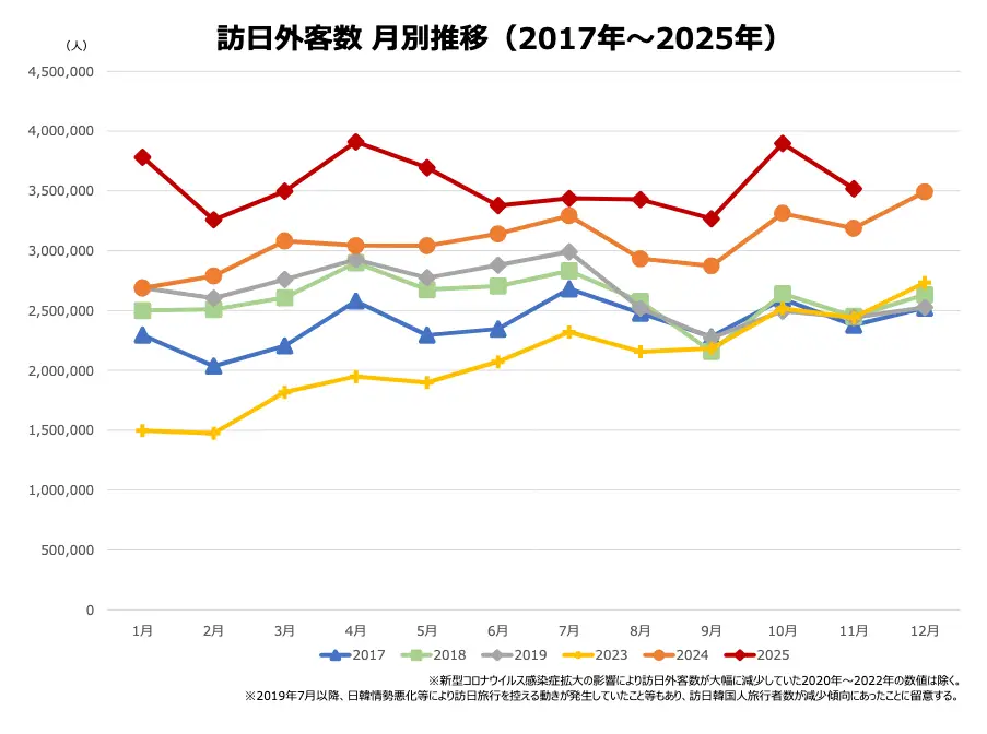 2025年11月訪日外客數為3,518,000人次,大幅刷新去年11月新高的318萬紀錄