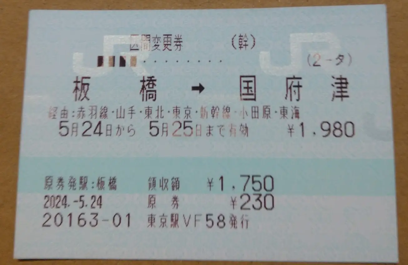 ●補「板橋---東京---小田原---國府津」的運賃1980円與原乘車券運賃230円的差價1750