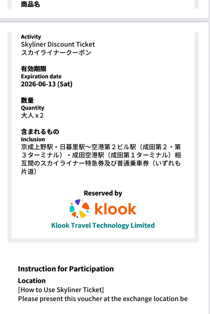 1. 讓售品項:Skyliner 京成電鐵單程票*2張(電子憑證成人票)共有兩組要售