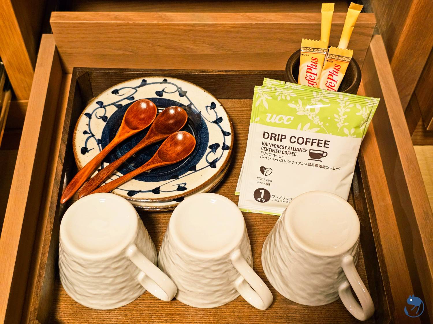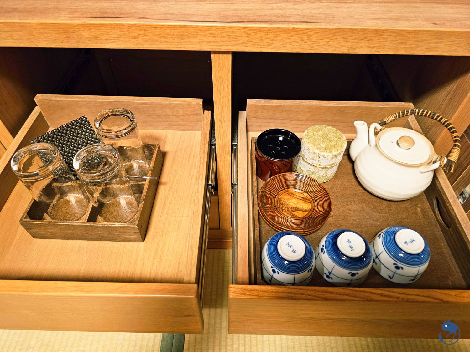 電視櫃底下是茶具、茶杯與咖啡和茶包。