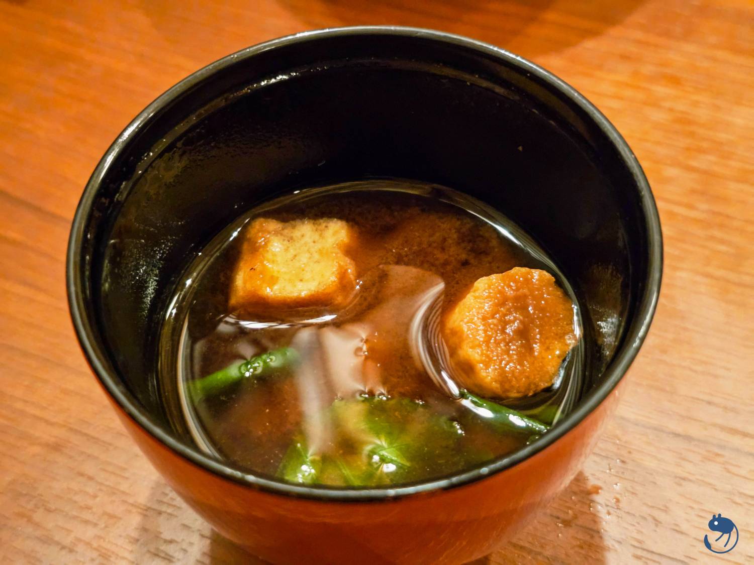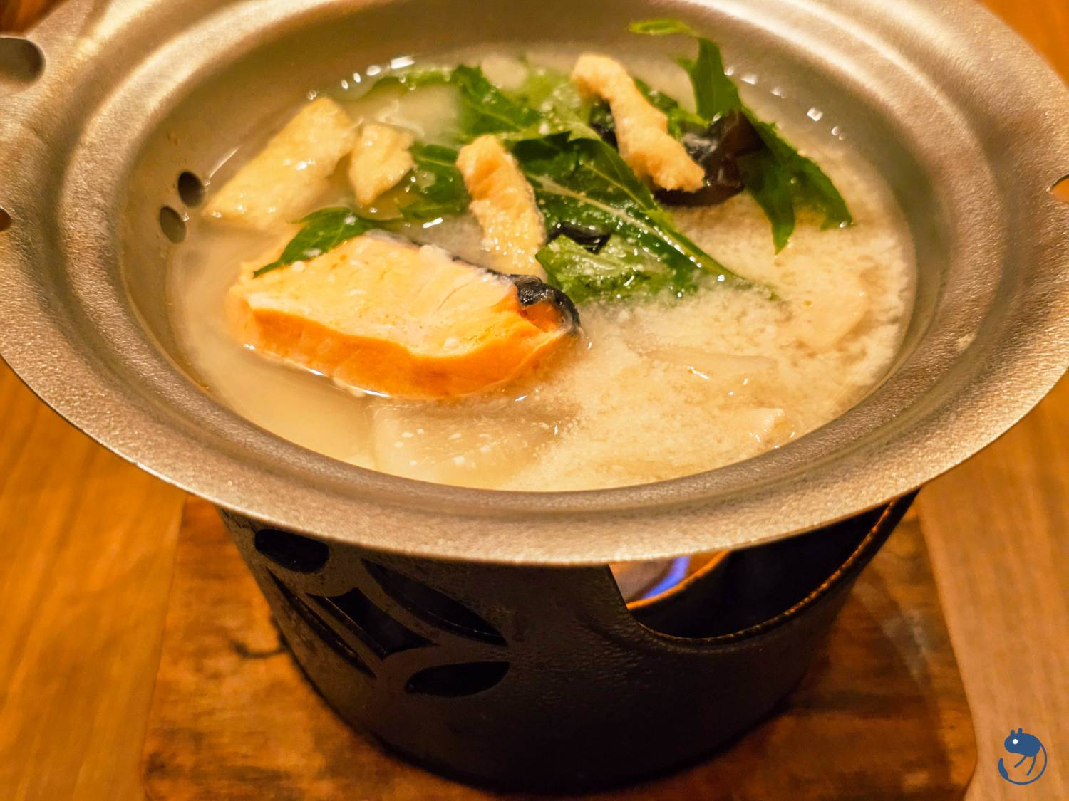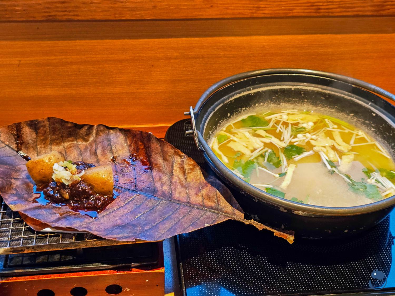 蔥與馬鈴薯的朴葉味噌與味噌湯。