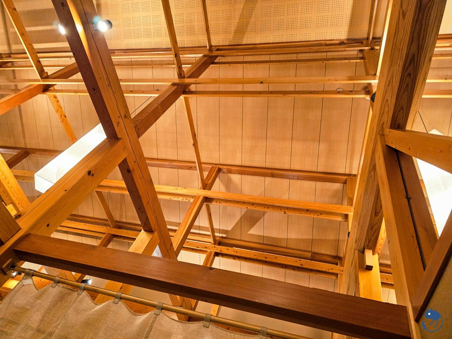 可以看到大廳上的橫樑是一根根彎曲的木頭,這彎曲的木頭叫做 チョウナバリ(根曲材