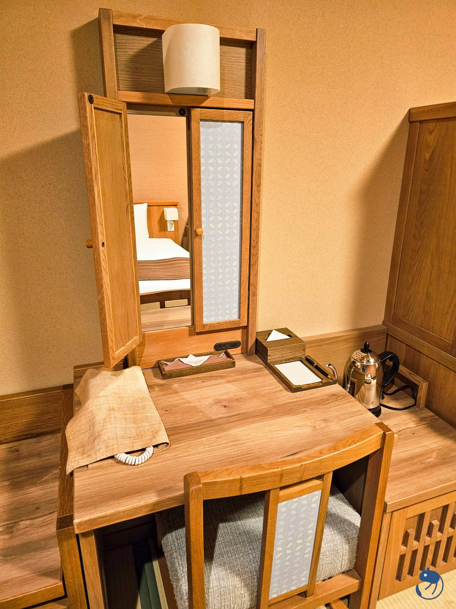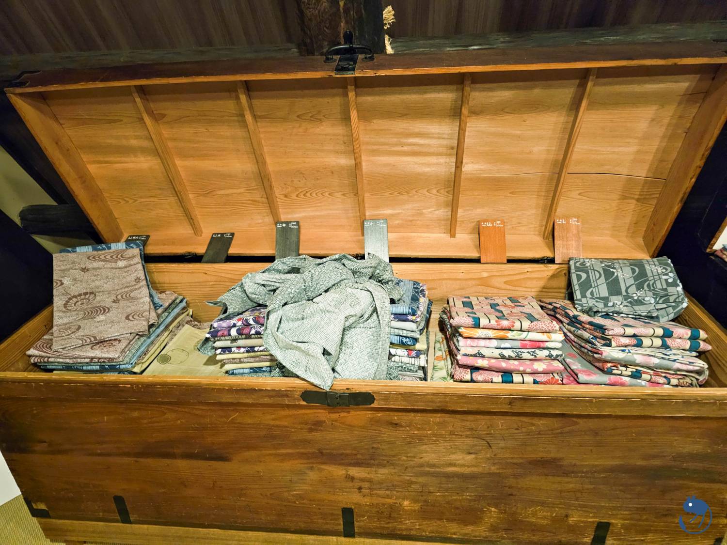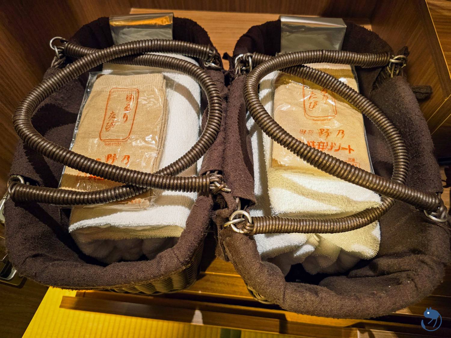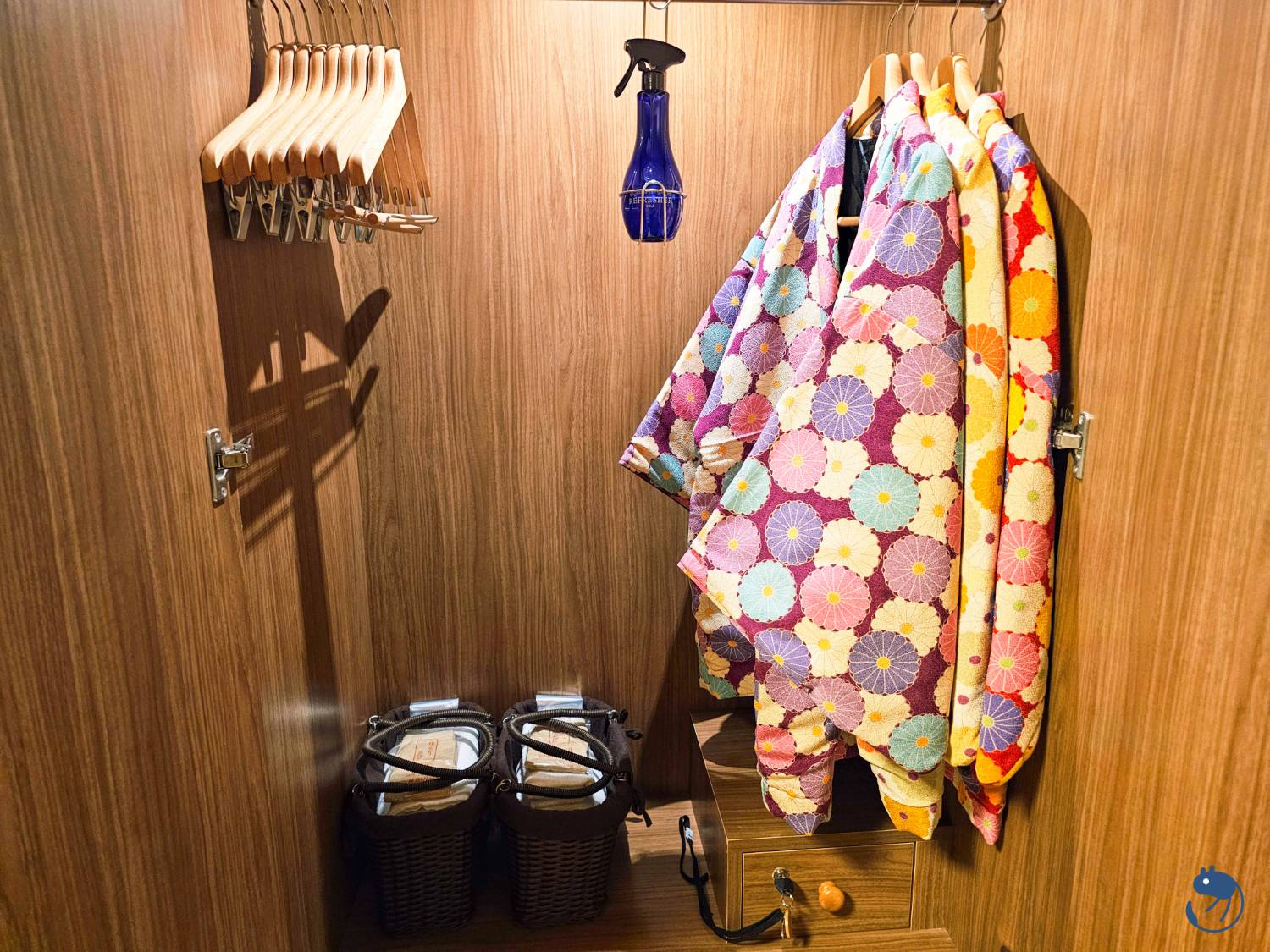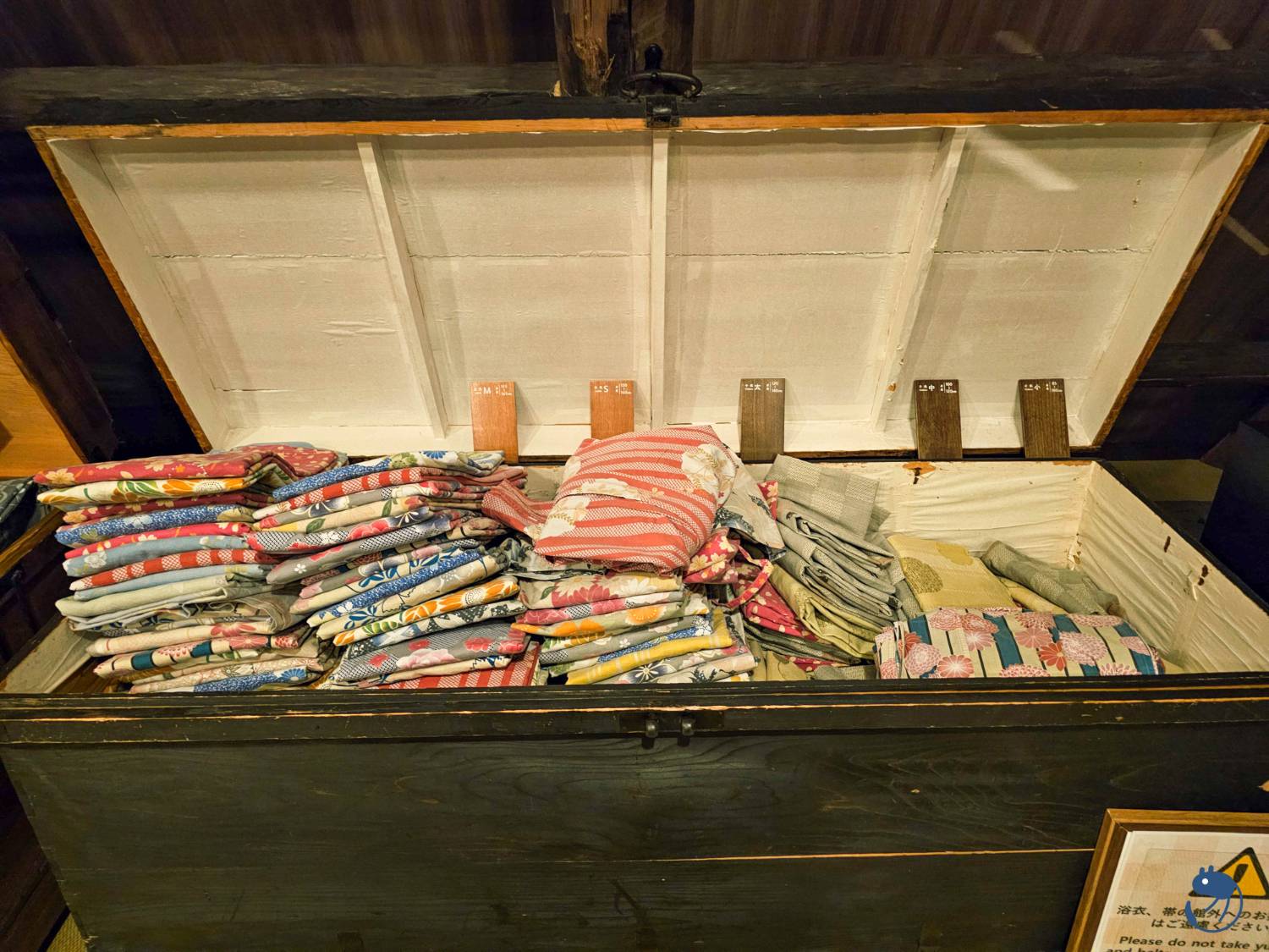 衣櫃裡有給女生穿的褞袍(どてら)以及泡湯籃,還有供旅館內穿著的襪子。