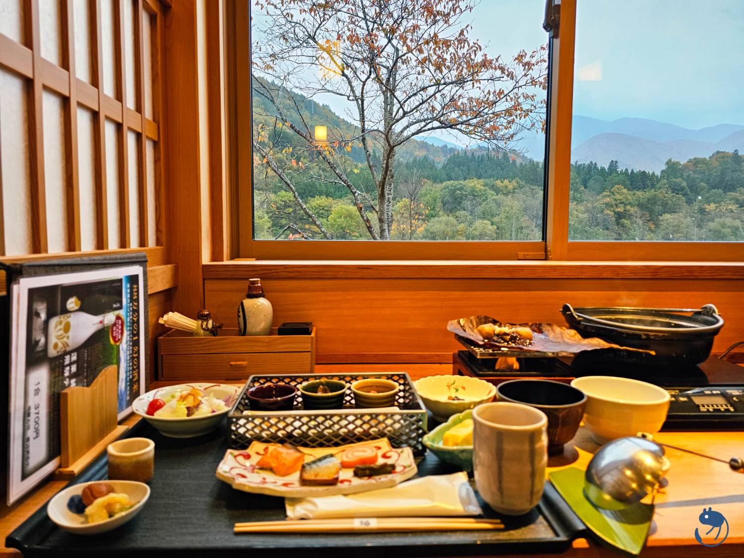 昨晚是在餐廳中間用餐,今早是一邊看著窗外的庄川景色一邊用餐。