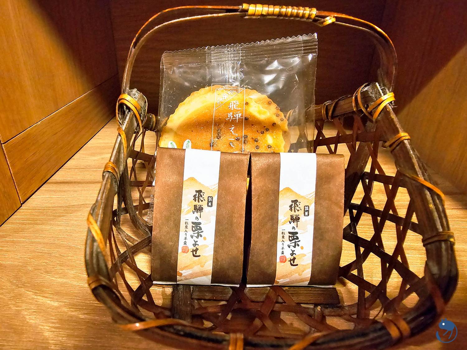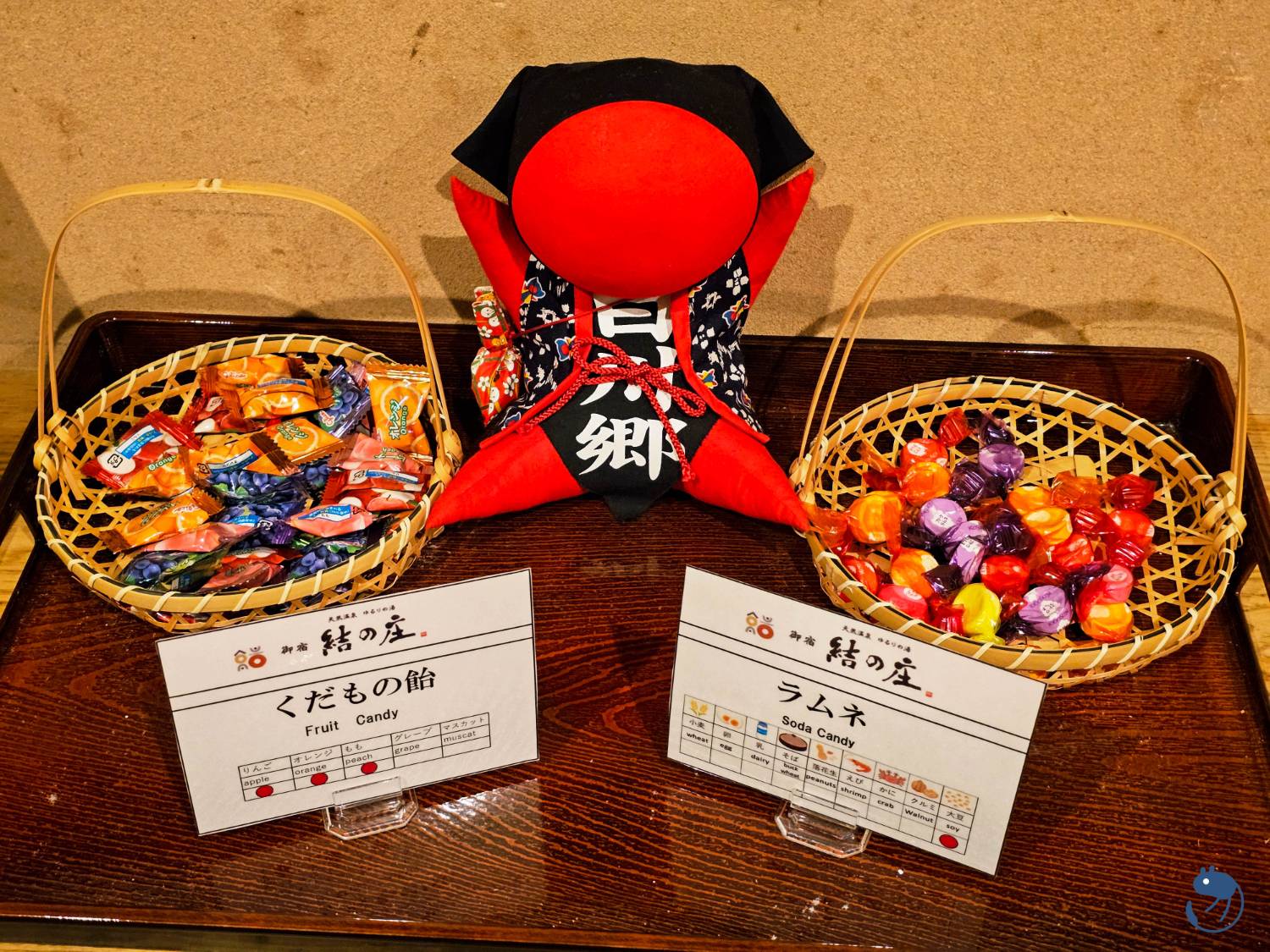 吃完後,餐廳門口擺著糖果,讓住客可以帶回房內吃。而中間就是在飛驒地區到處都能看