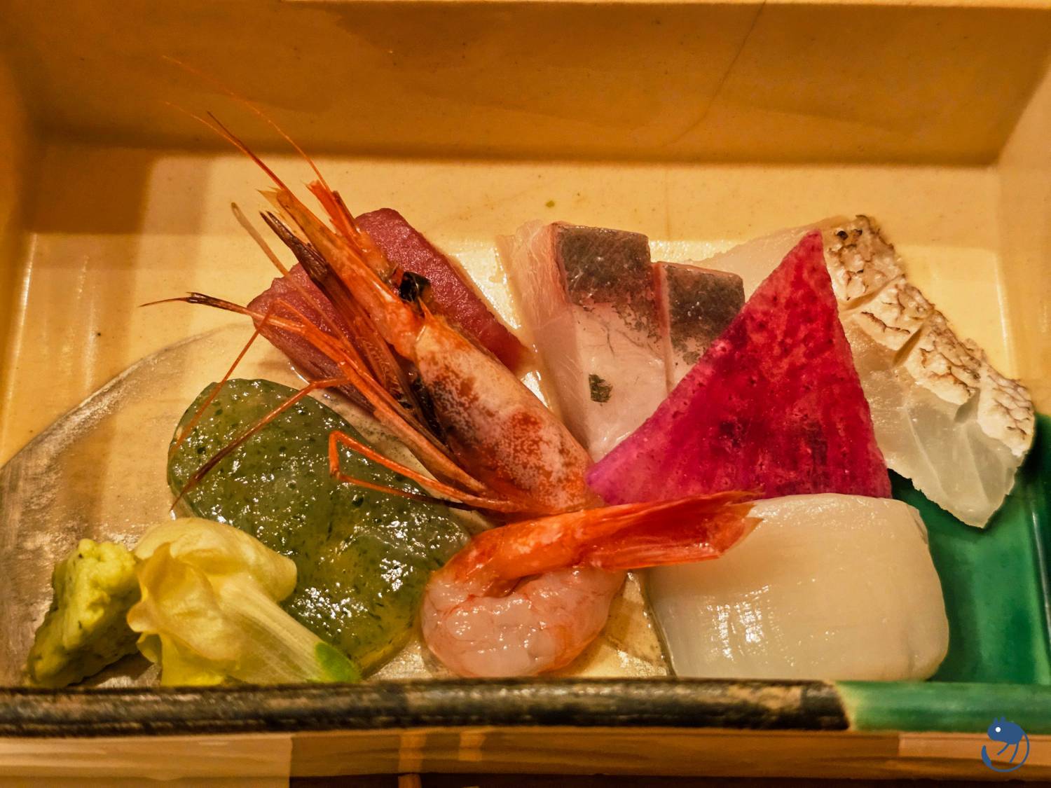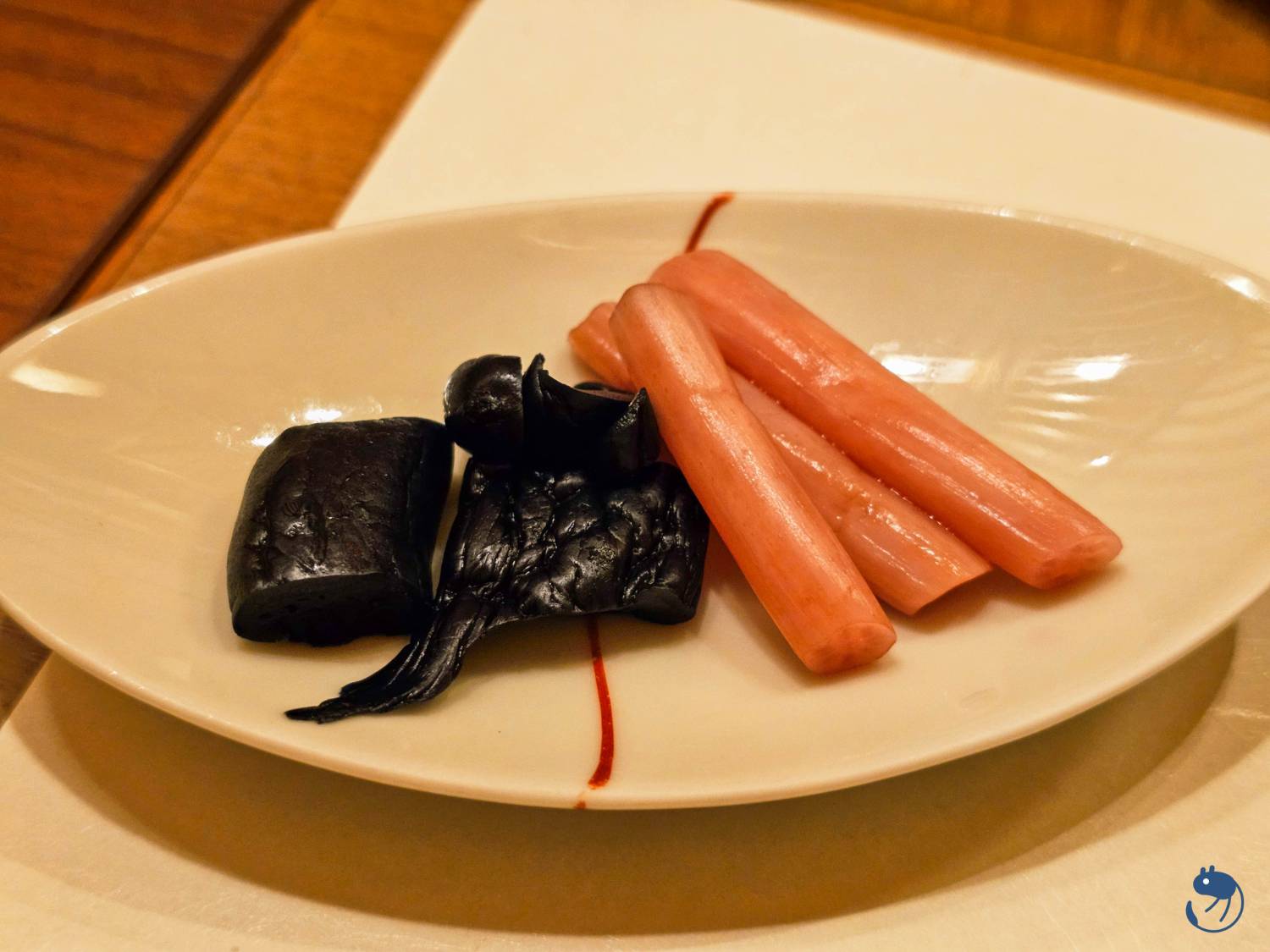 再來中間是由左到右,由上到下分別是醋拌海蜇皮、昆布漬旗魚、鮭魚卵佐蘿蔔泥,蘿蔔