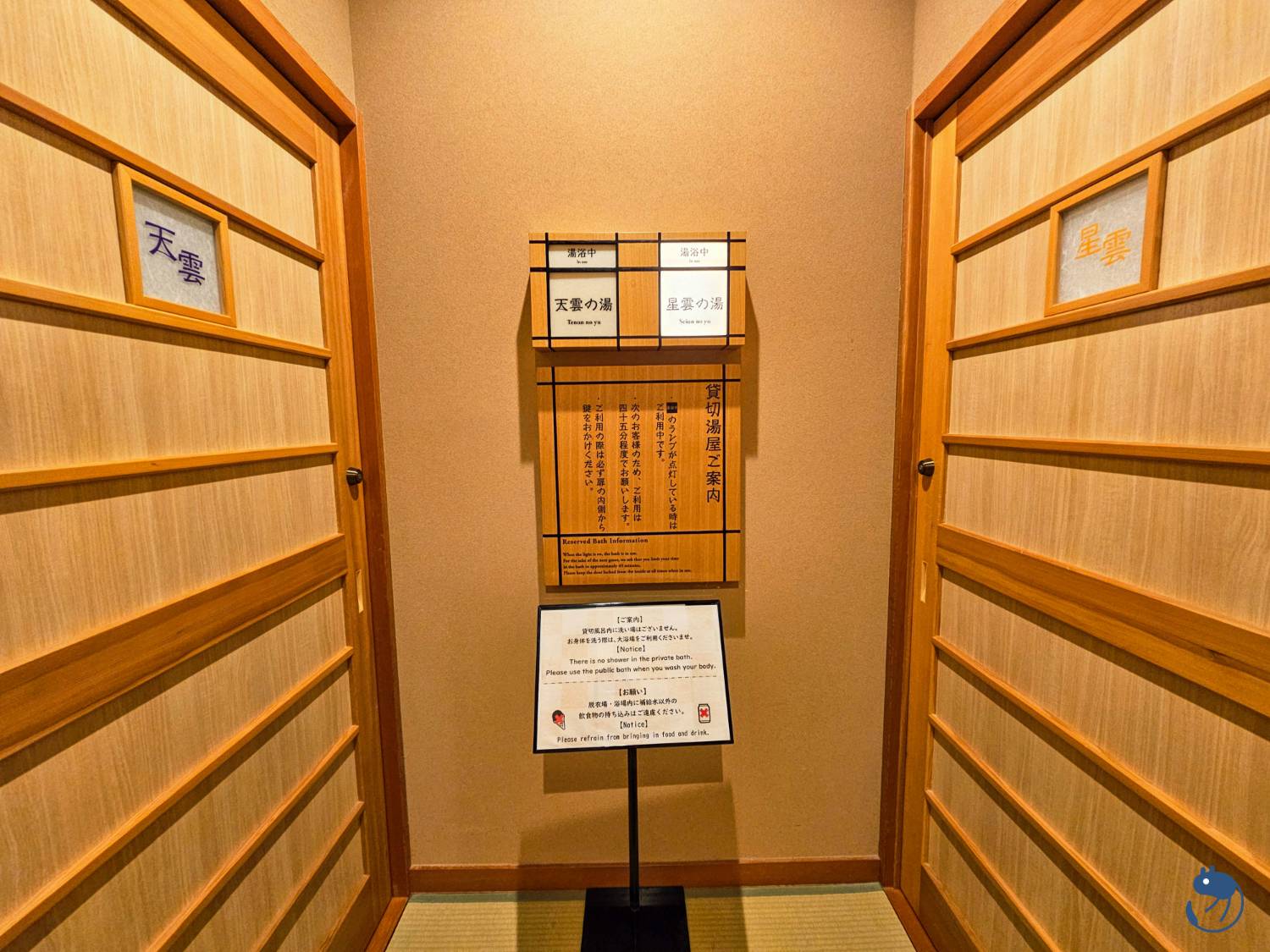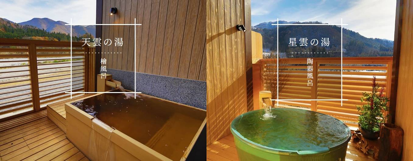 除了大浴場外,旅館內還有兩個私人湯屋,分別是檜木的天雲與陶器的星雲。