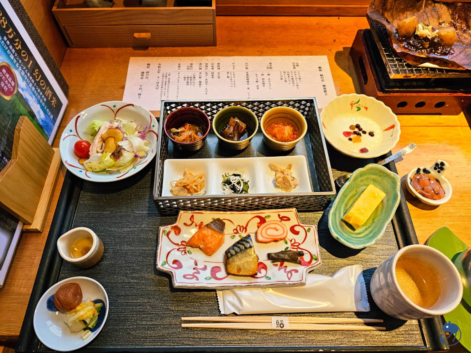 烤物是西京燒鮭魚、紅卷蒲鉾、味醂鯖魚與佃煮蜂斗菜。
