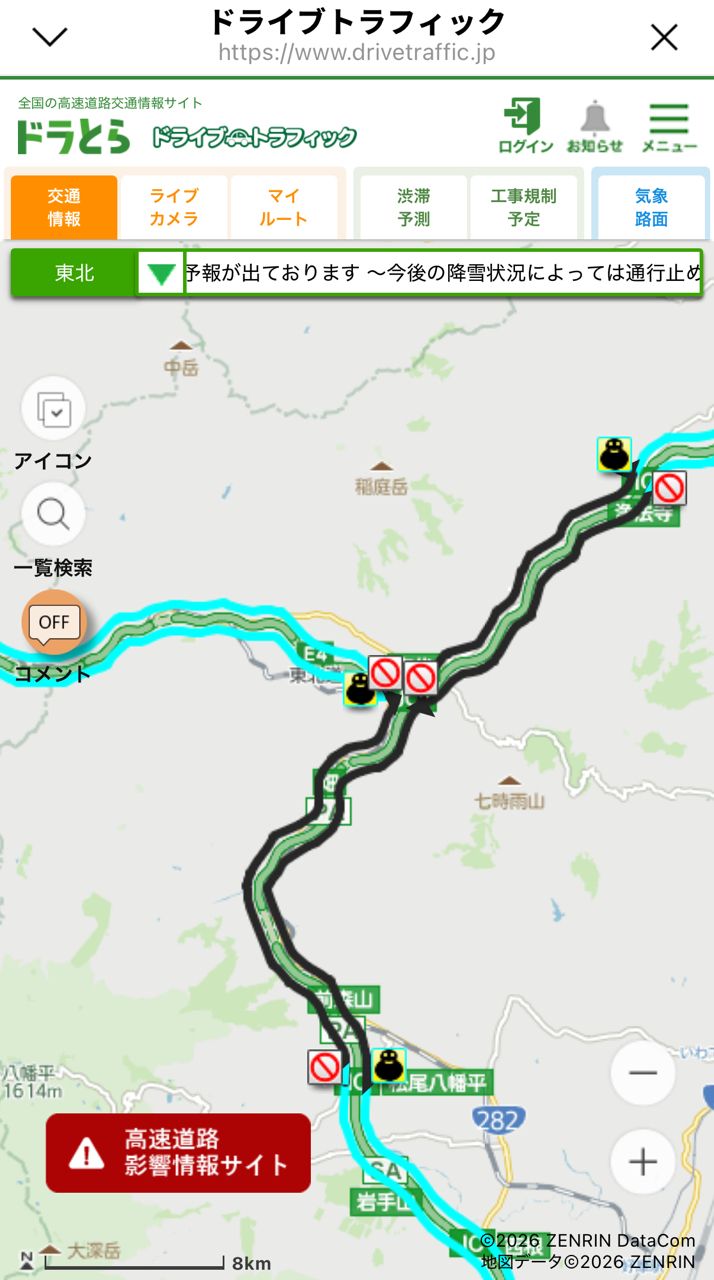 東北自動車道黑石以北段持續封路,當天新聞青森市區有救援紀錄共400多台台車卡住