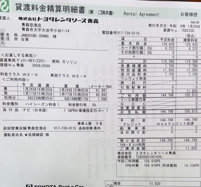 這次指定車型與安心租車保險方案,租車費用日幣144798元,換算台幣29580元,交車時