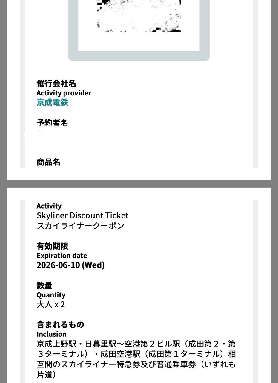 skyliner 單程2人 2026.6.10 & 2026.6.13,共兩組