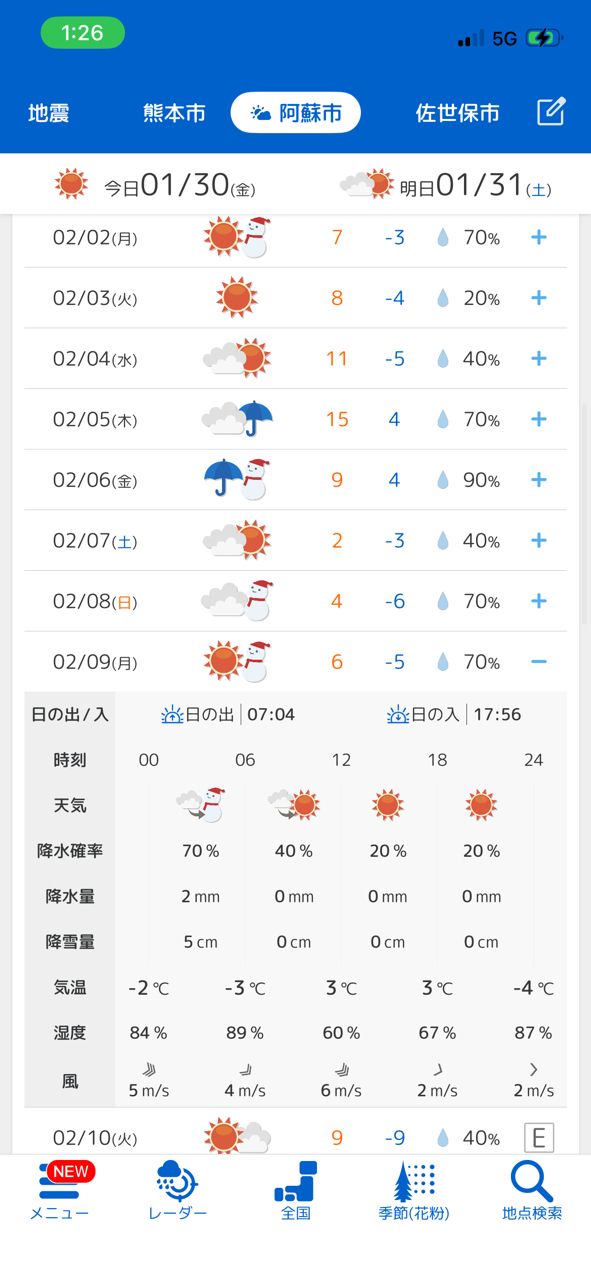 想請教版上大家,預計2/9會自駕上阿蘇,我們有租有雪胎的車,但因為目前氣象預報有5