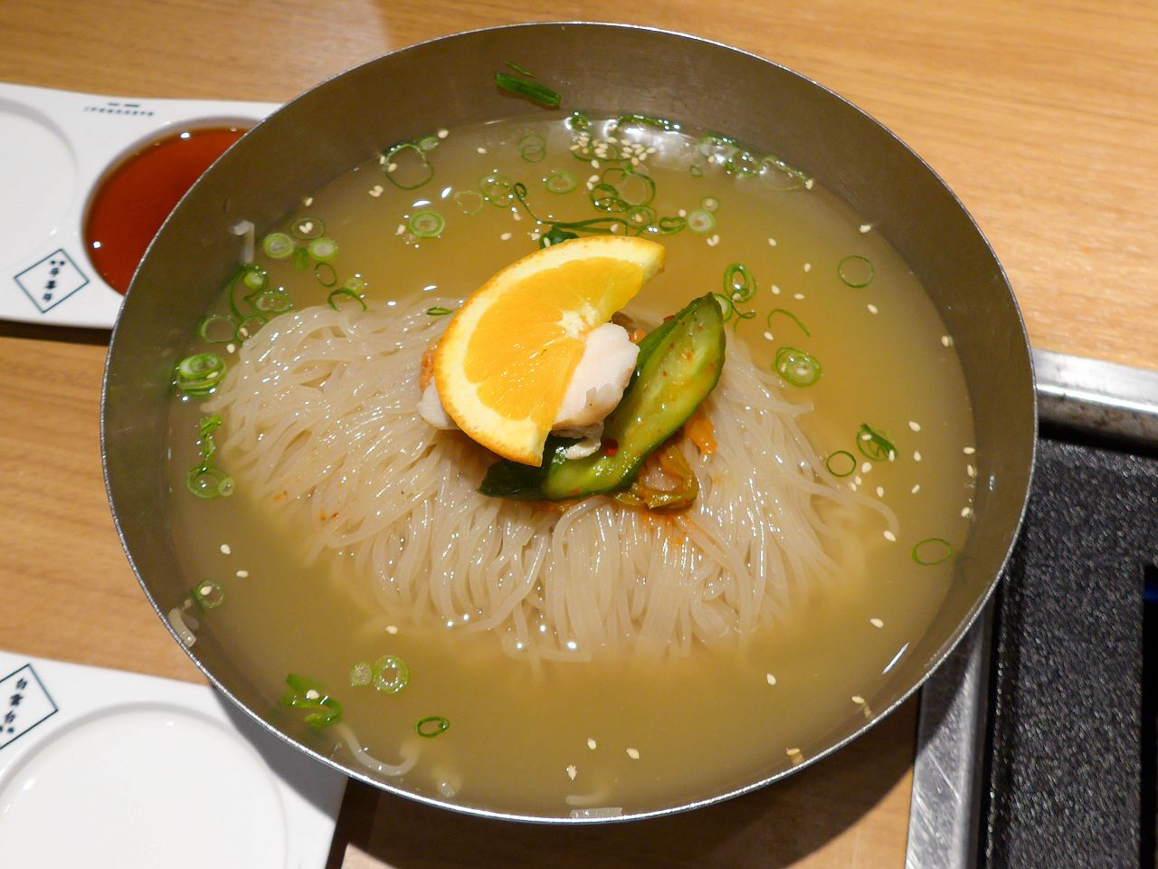 配料有柳橙片、醃黃瓜、韓式泡菜。