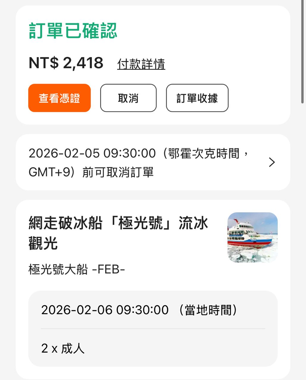 [讓售] 2/6網走破冰船「極光號」成人票三張