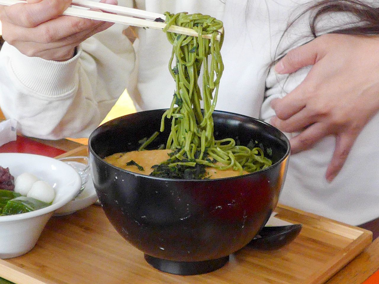 將宇治碾茶混合2~3種粗磨蕎麥粉製作的宇治碾茶生茶蕎麥麵,