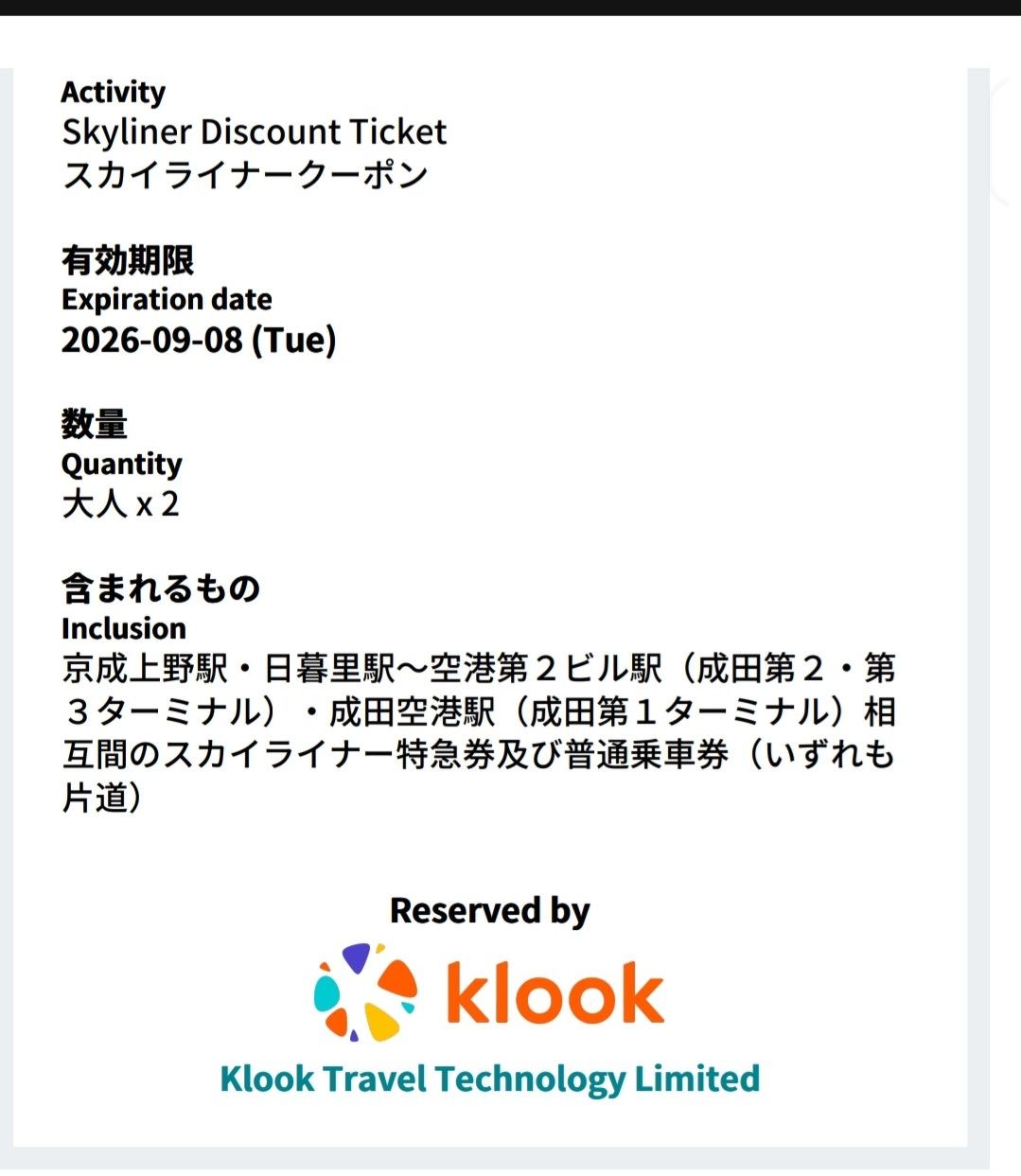 skyliner單程2張