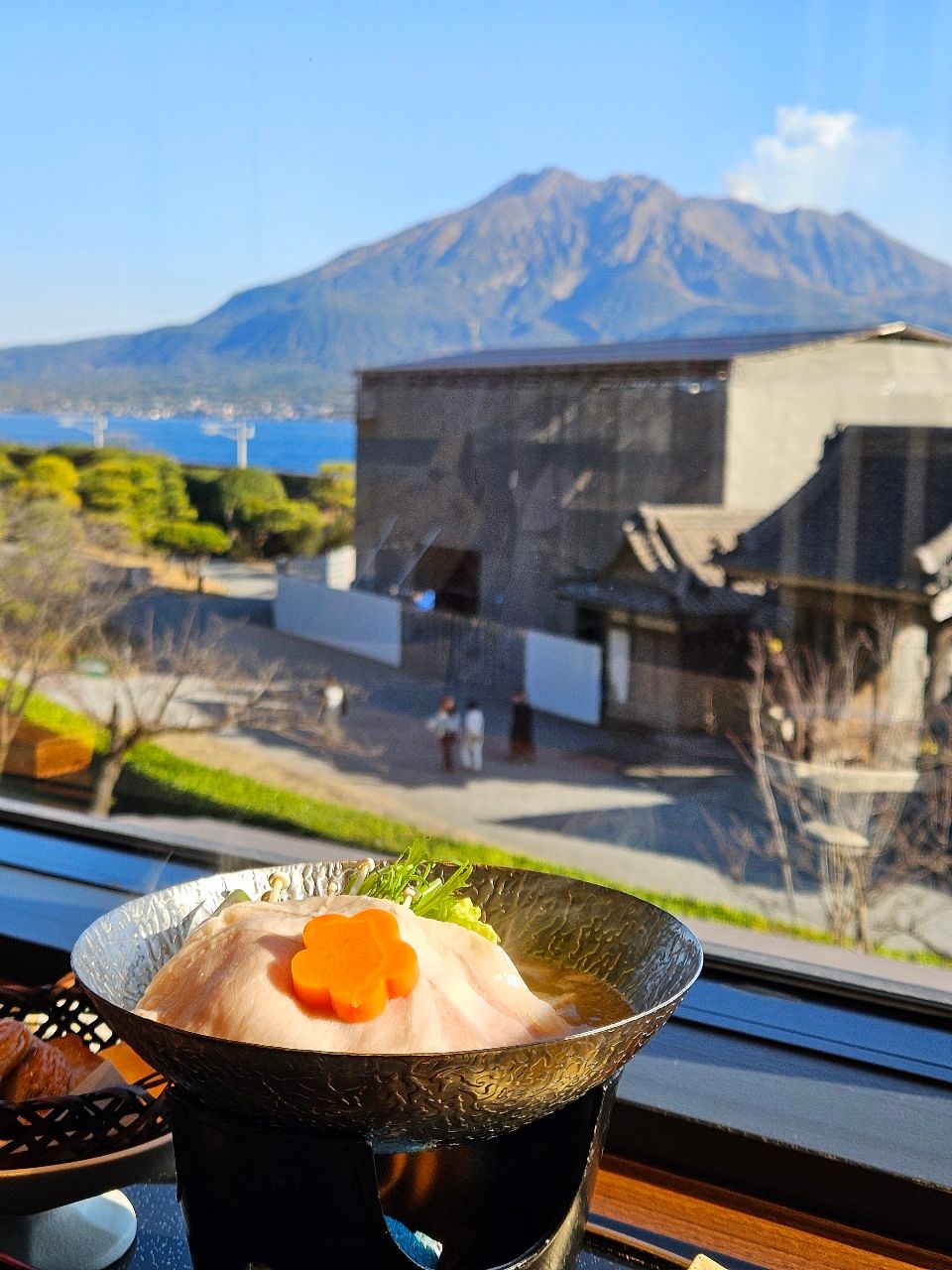 灣。我們點的黑豚鍋在滾,遠方的櫻島也在冒煙——火上加火!