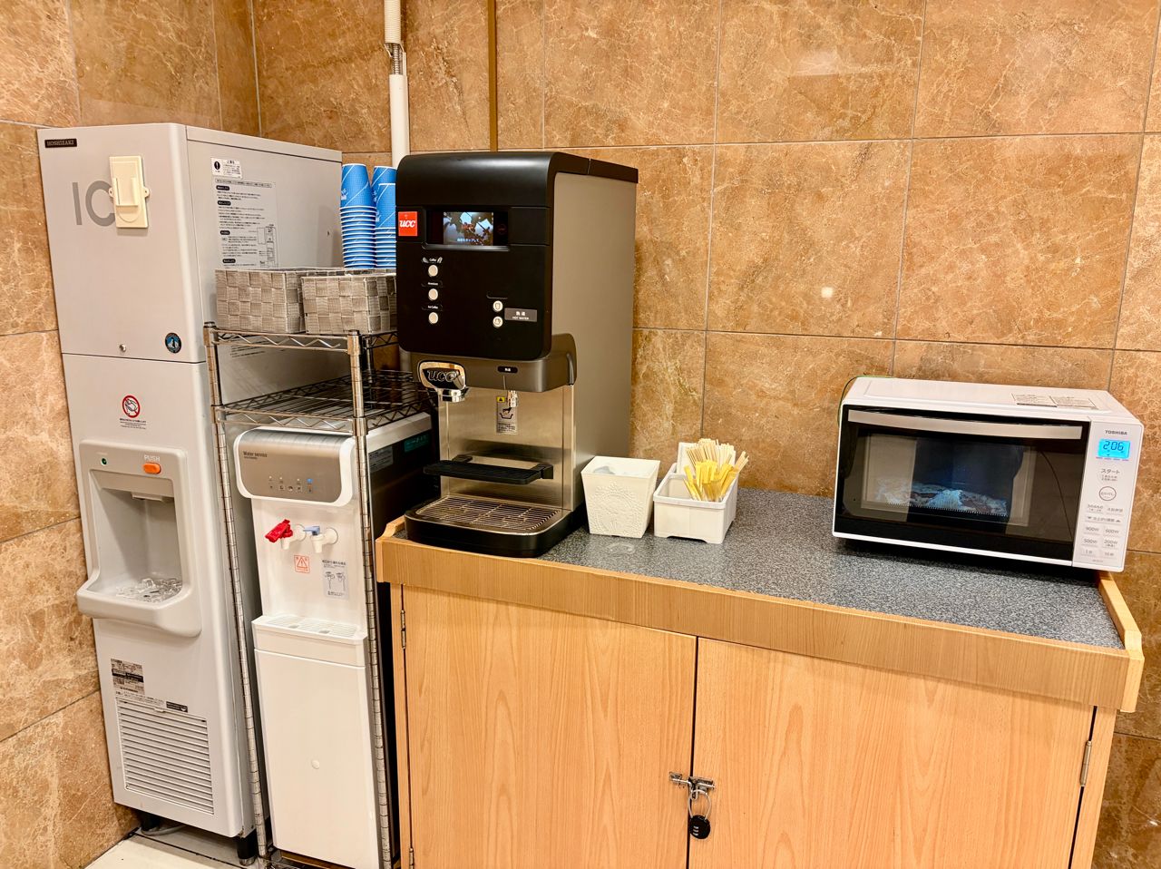 一樓大廳有可以自行依需求索取的備品、微波爐、咖啡和製冰機。