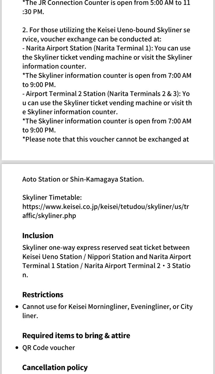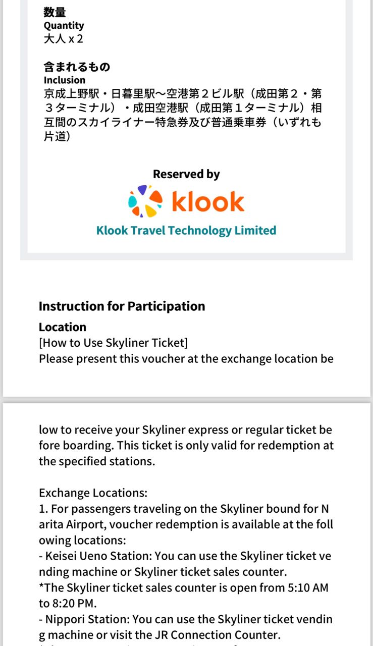 1. 讓售品項:Skyliner京成電車車票 單程票 成人*2