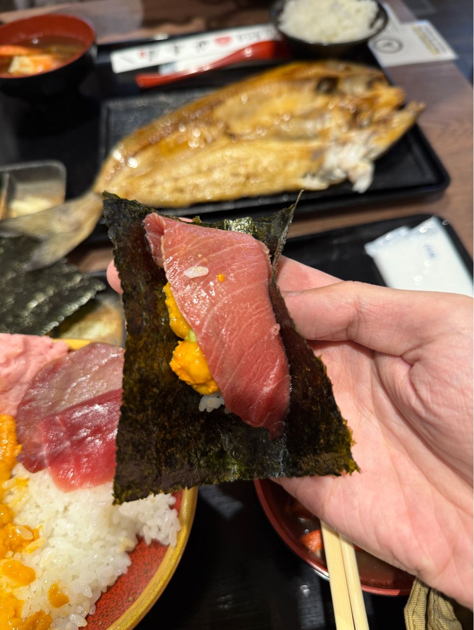 海膽吃起來真的超甜,完全沒有其他怪味,飯記得選醋飯,蠻推的,一夜干則是可以吃很