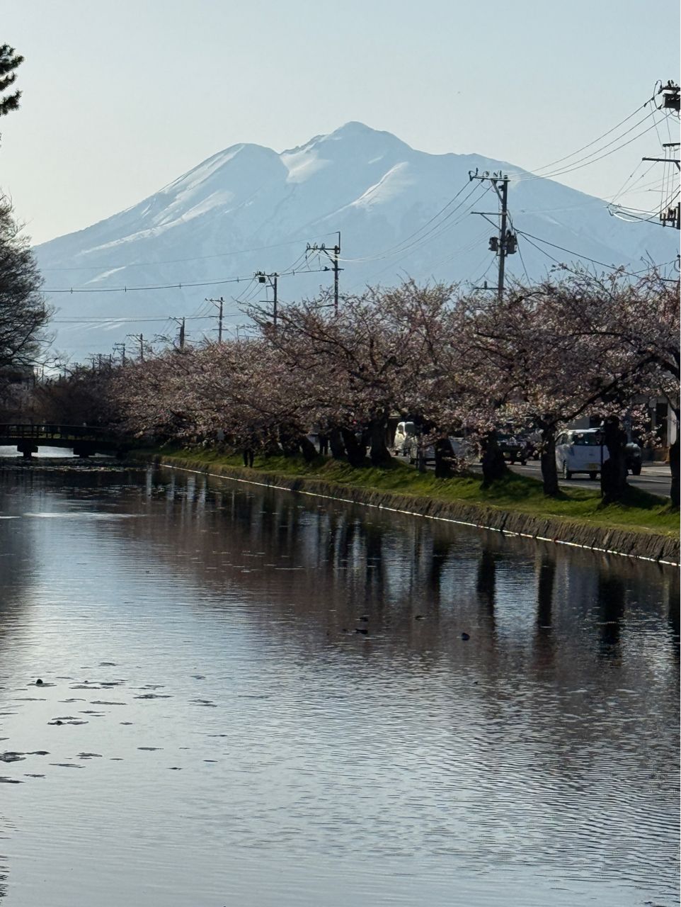 整排櫻花樹配上岩木山好美啊
