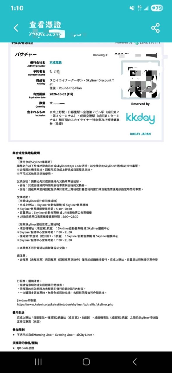 僅限於成田機場/上野/日暮里skyliner售票櫃檯兌換實體票