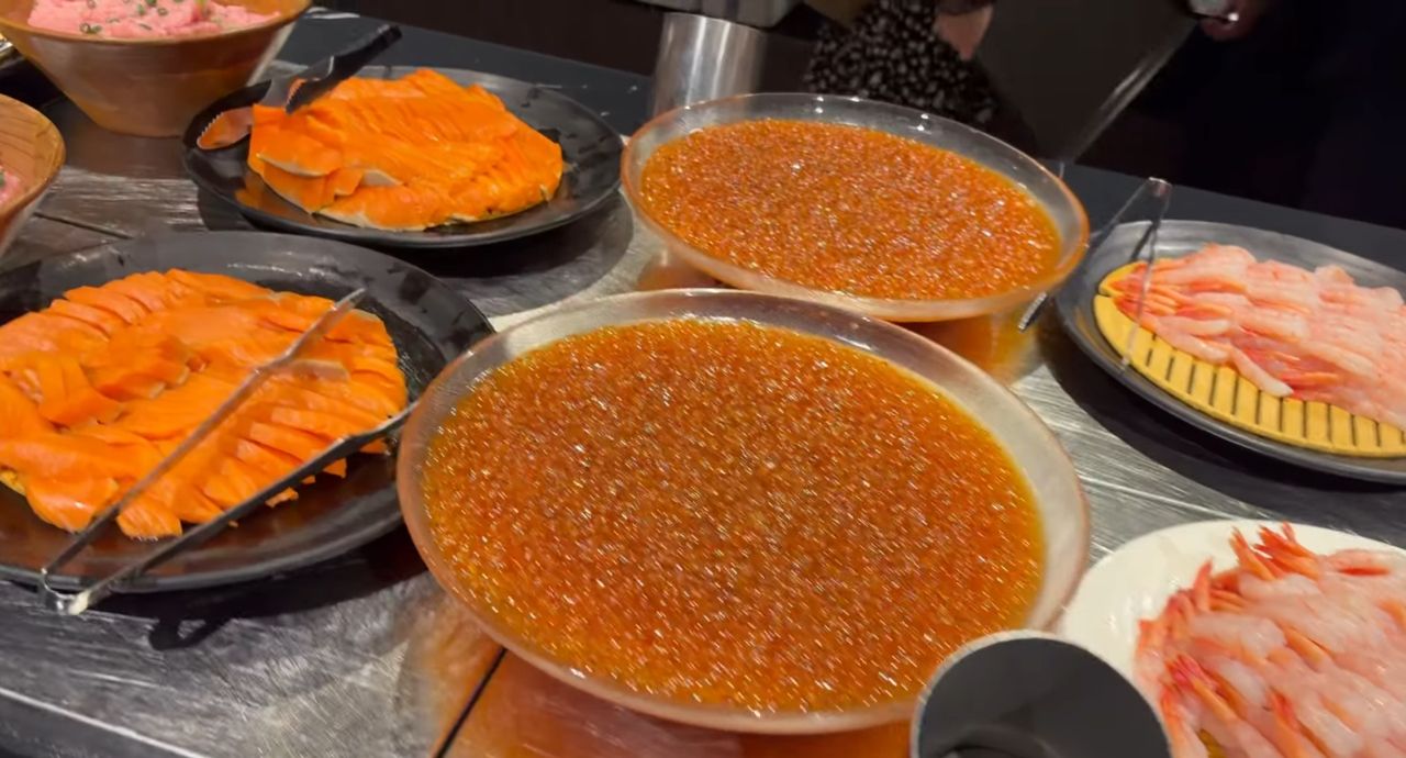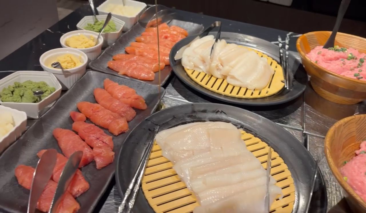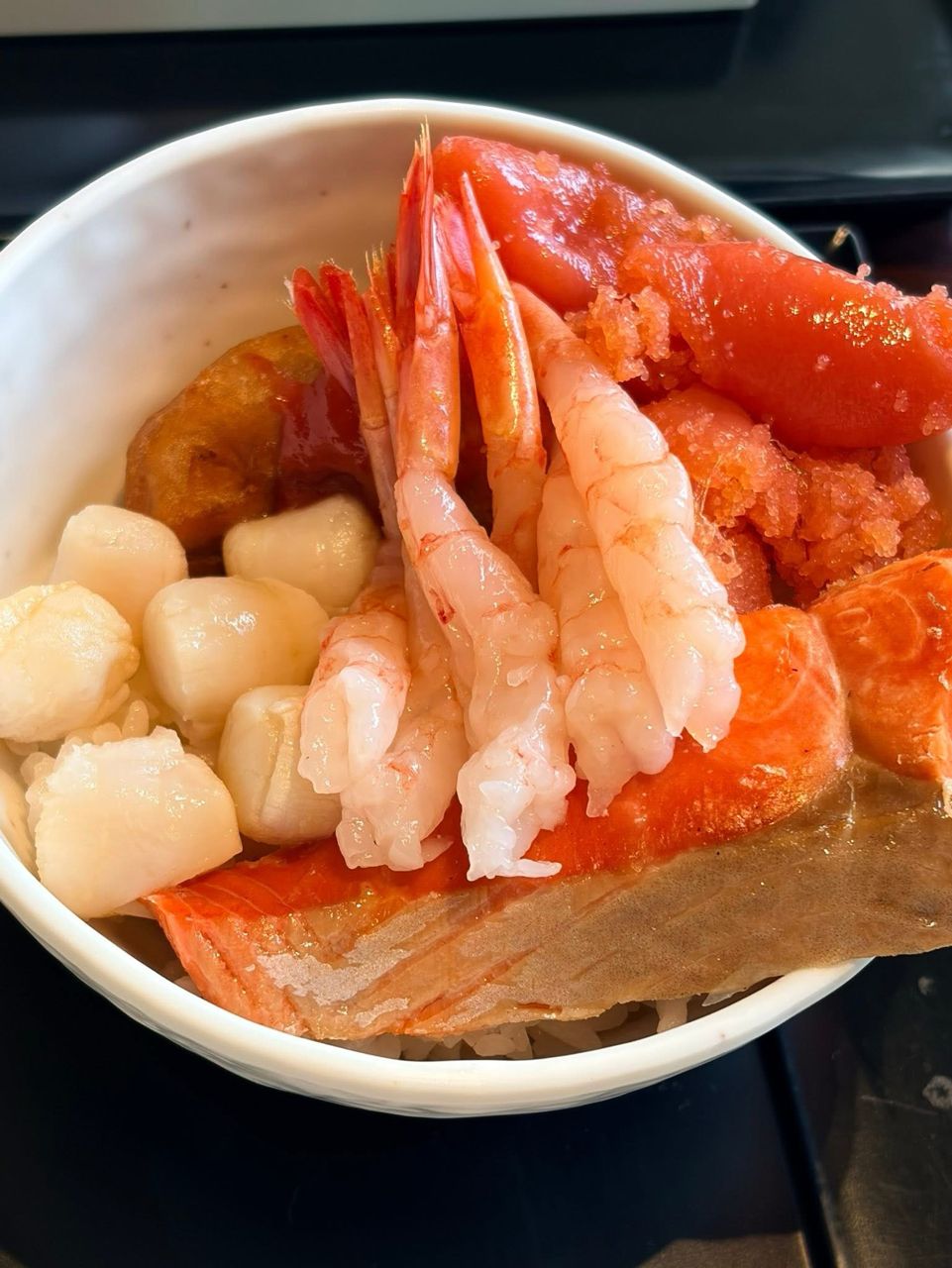 4/9早餐超強的可自製海鮮丼,甜蝦、鮭魚卵、鮭魚、鮪魚泥、軟絲生魚片、明太子!