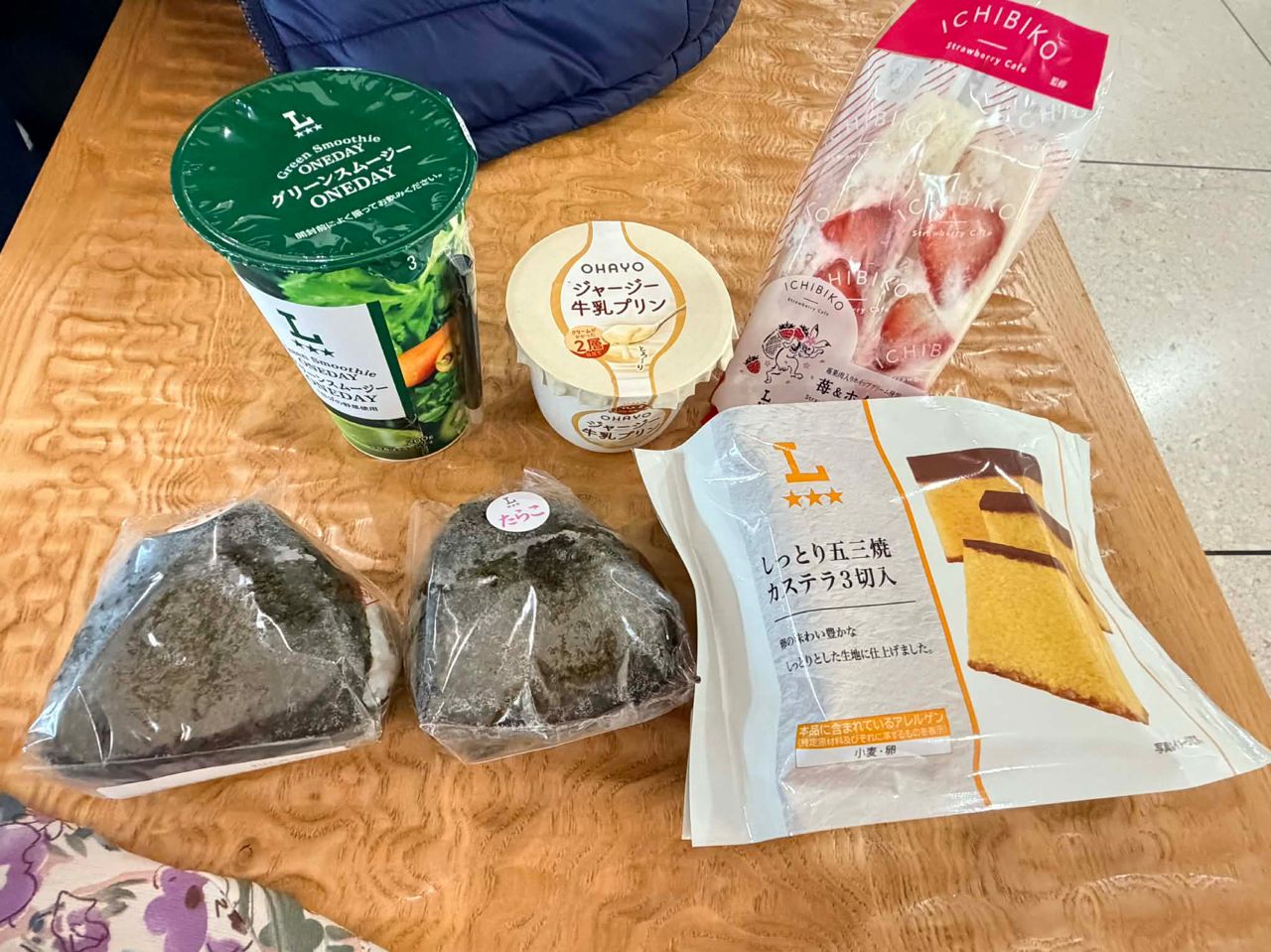 那個飯糰是溫溫的耶不是冷的,五三燒去年去東京買過很不錯就拿了,看到草莓三明治當