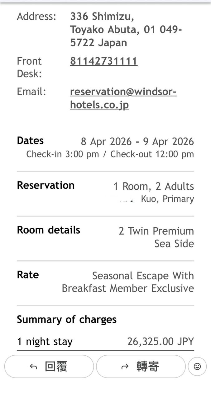 修,入住時候幫我改洞爺湖景側(等於是升等因為湖景房比海景貴)可以泡天然溫泉還主