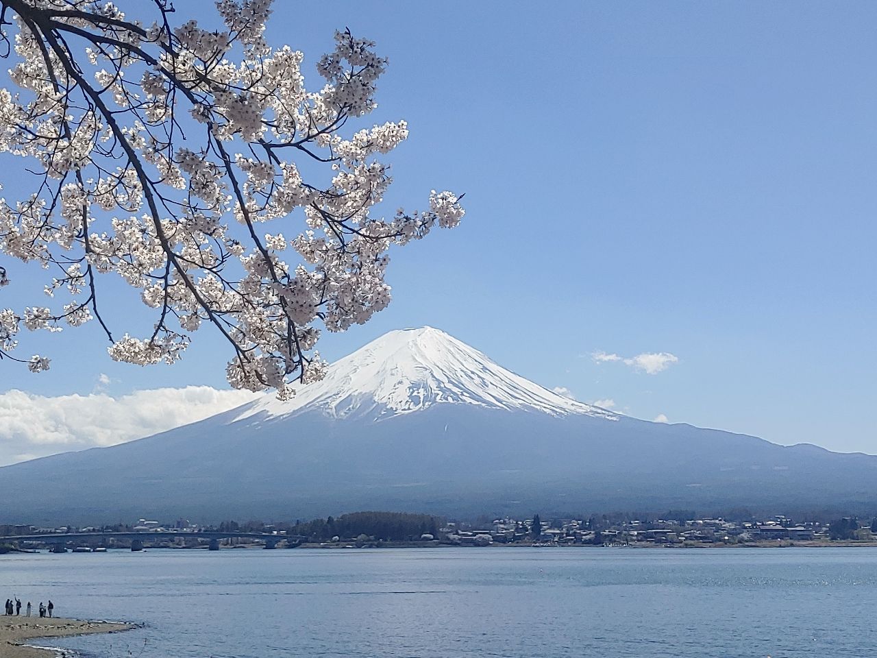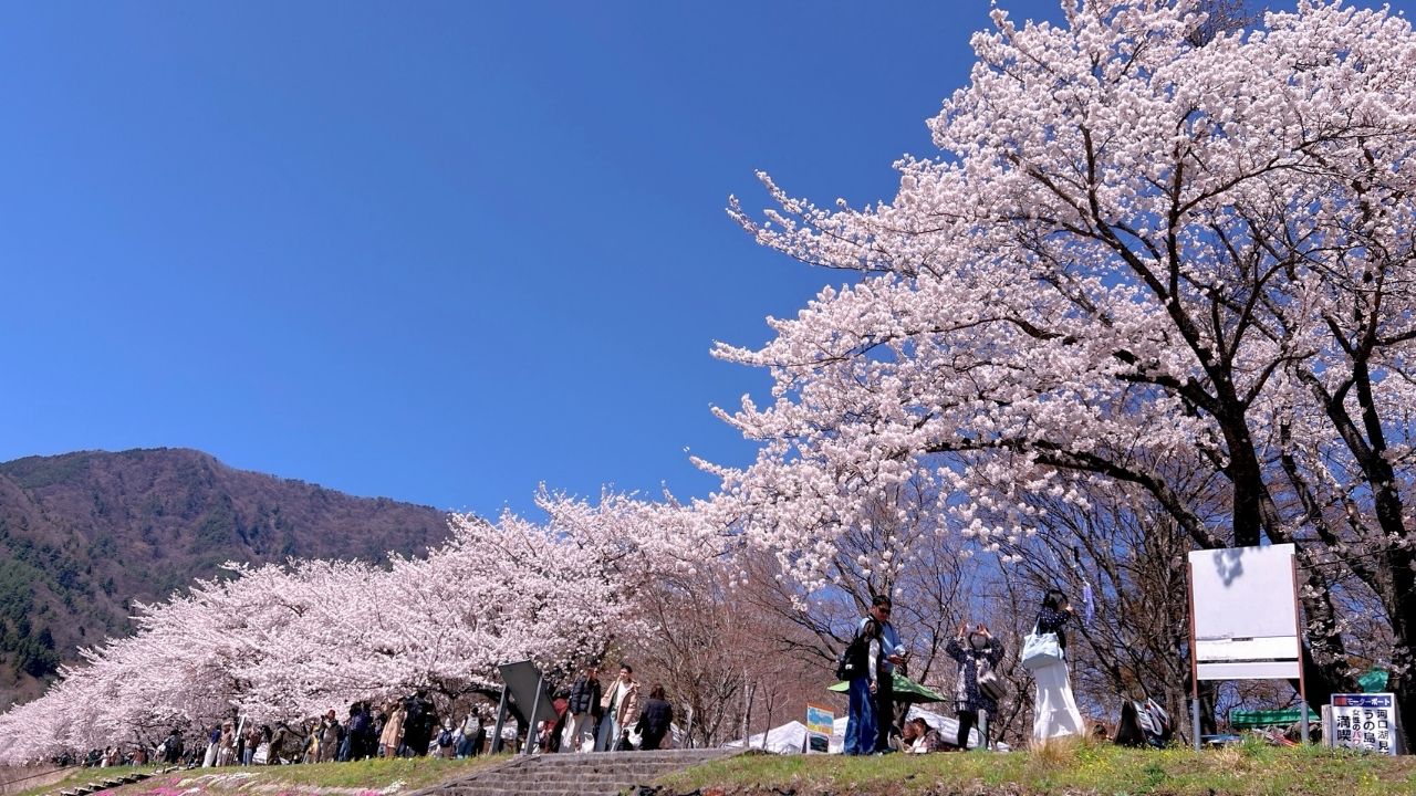 湯後上車,整車是滿人的,位置算小有廁所,乘車約2小時後到站。賞櫻人潮堆滿了河口