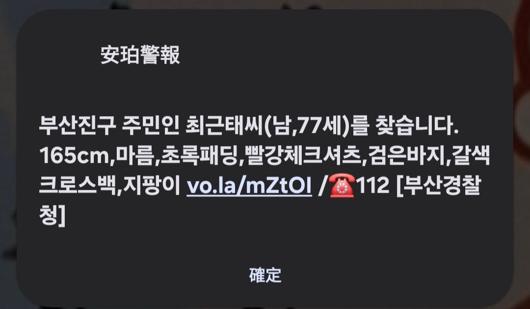 我在首爾玩時也收過類似的,當時截圖去翻譯,應該是搜尋失蹤的老人家,所以才會講到