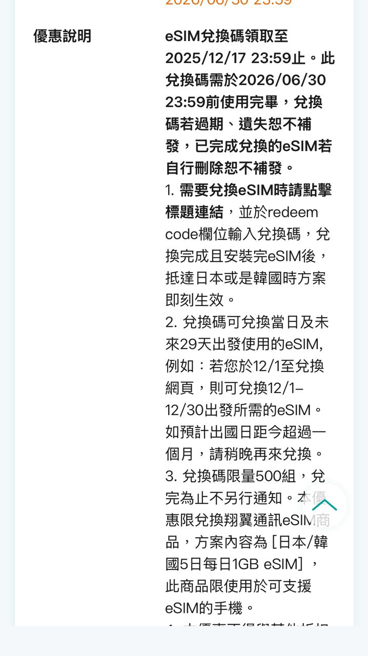 交易方式:提供台新帳號或街口帳號,匯款後提供eSIM 序號,需自行前往翔翼通訊網站
