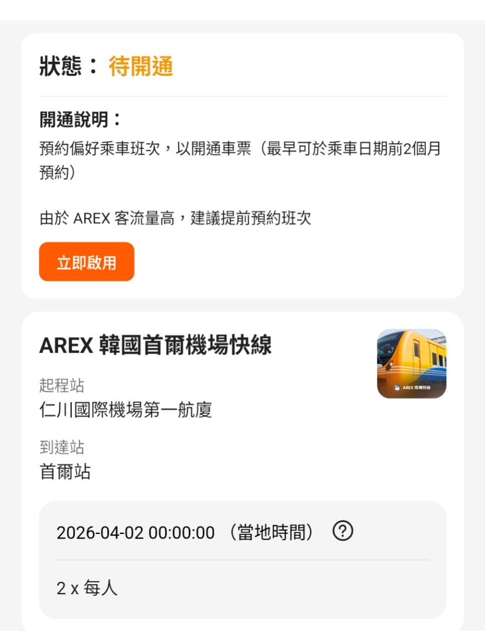 商品名稱: AREX機場快線 仁川機場1航-首爾站 2張
