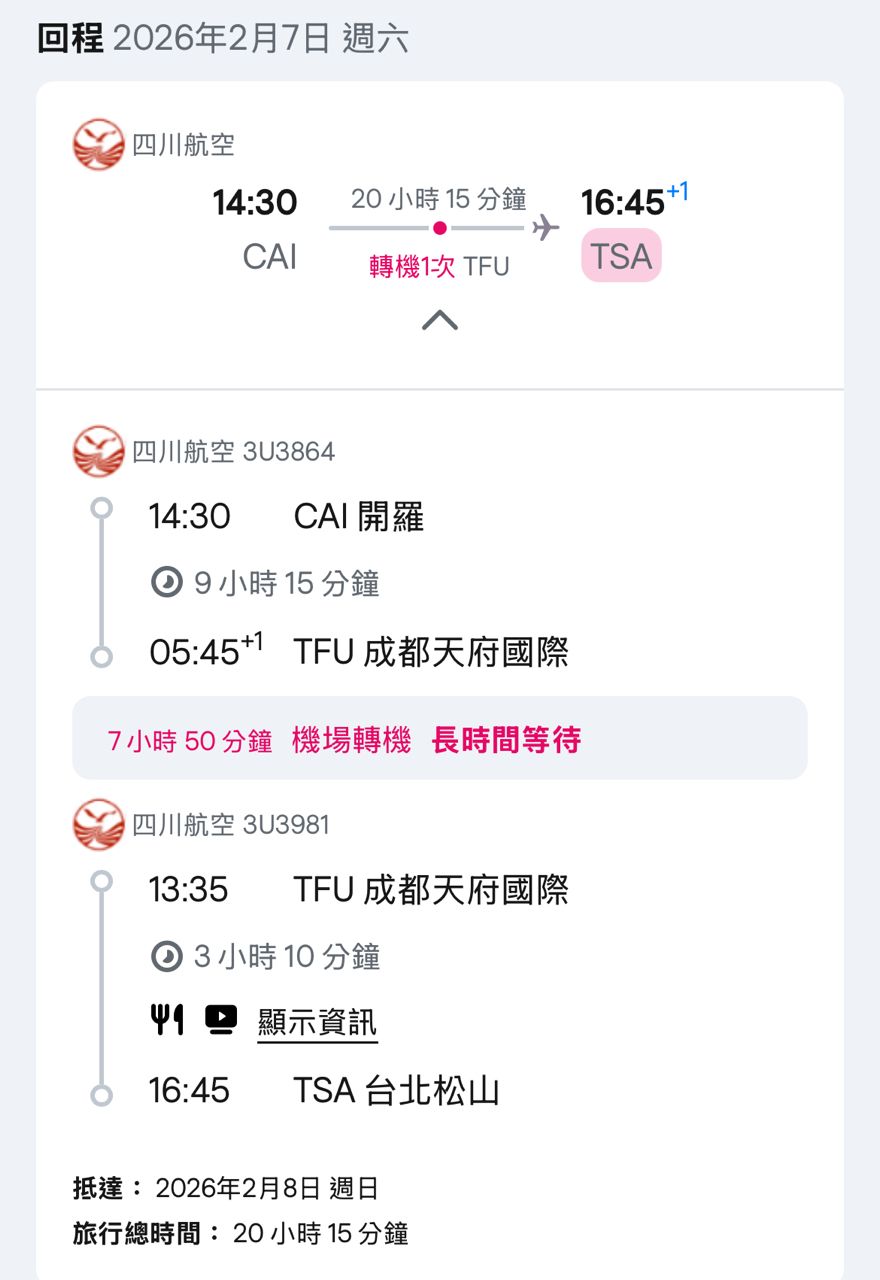 [詢價] 2026/01/27-02/07 台北到開羅機票